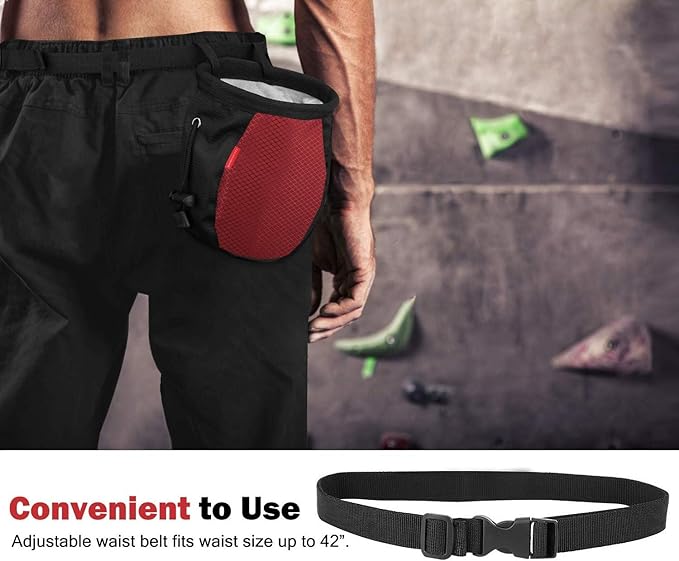 - ADJUSTABLE BELT - This rock climbing chalk bag woven belt can adjust up to 42 inch long to meet different exercise requirements. Suitable for men and women for easy fastening the belt and reaching the chalk.
