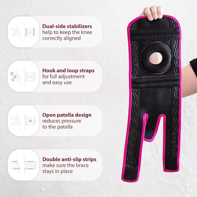 - KARM Pink Kids Knee Brace is available in one size and is suitable for 4-15-year-old children to make shopping easy for parents. Kids knee support brace offers high-level support and features side stabilizers to offer more stability than pull-up knee sleeves and knee straps. Use for different sports, minor ligament injuries, instability, twisted knee, tendonitis pain, torn meniscus, and swelling.