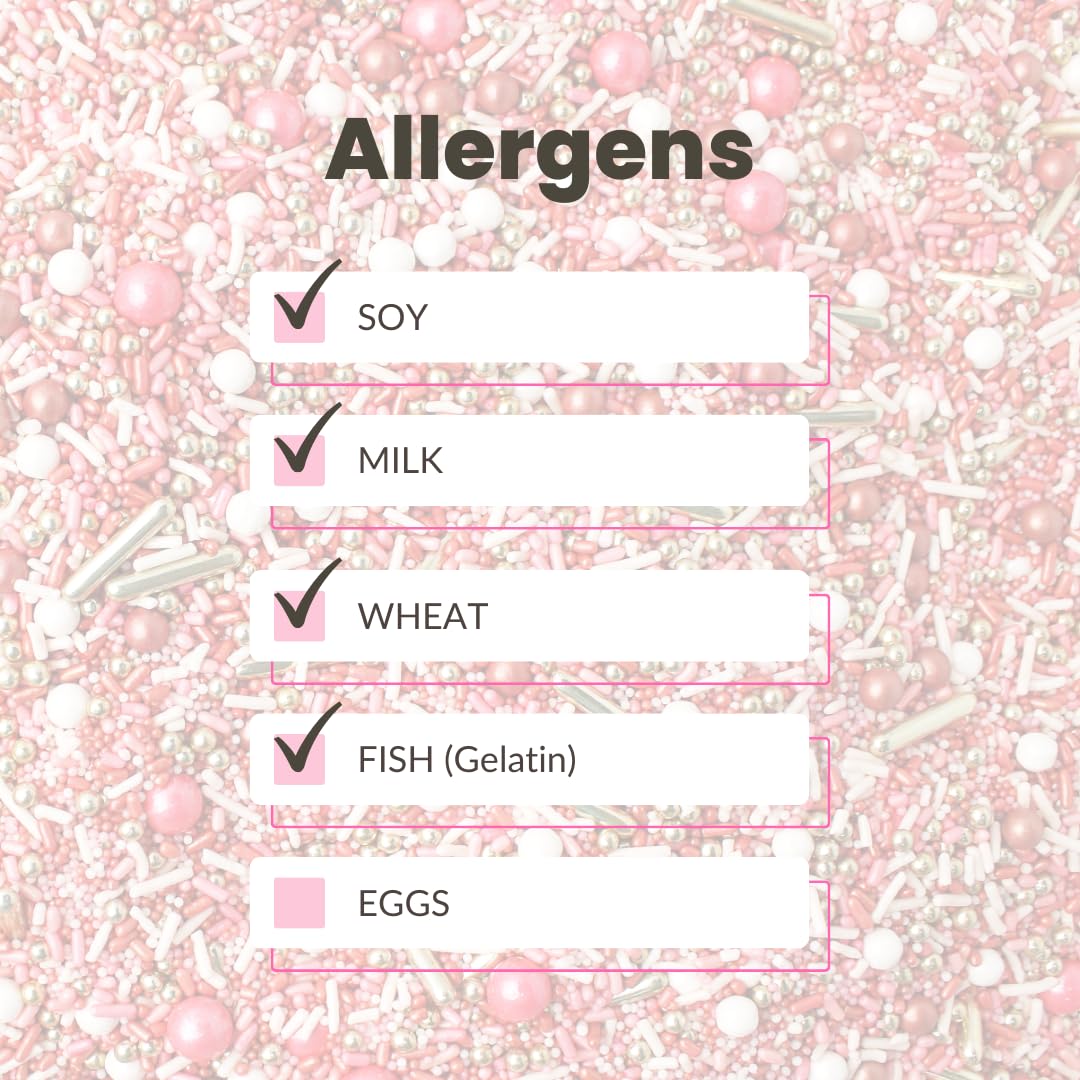 - Allergen & Safety Notice: Made in a facility that processes wheat, eggs, milk, soy, and tree nuts. Some blends contain hard sugar pearls and dragee rods, which may pose a choking hazard for children under 1
