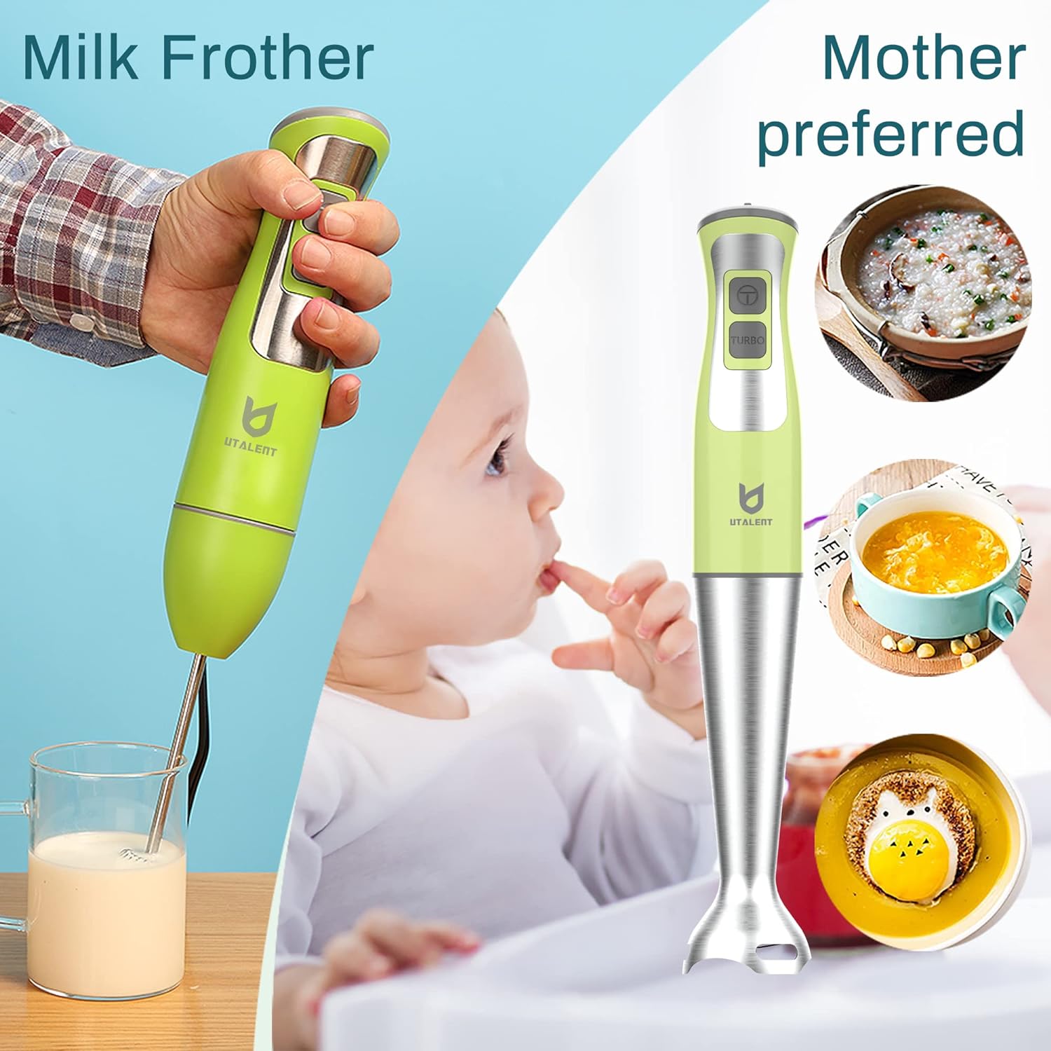 Immersion Hand Blender, UTALENT 3-in-1 8-Speed Stick Blender with Milk Frother, Egg Whisk for Coffee Milk Foam, Puree Baby Food, Smoothies, Sauces and Soups - Green