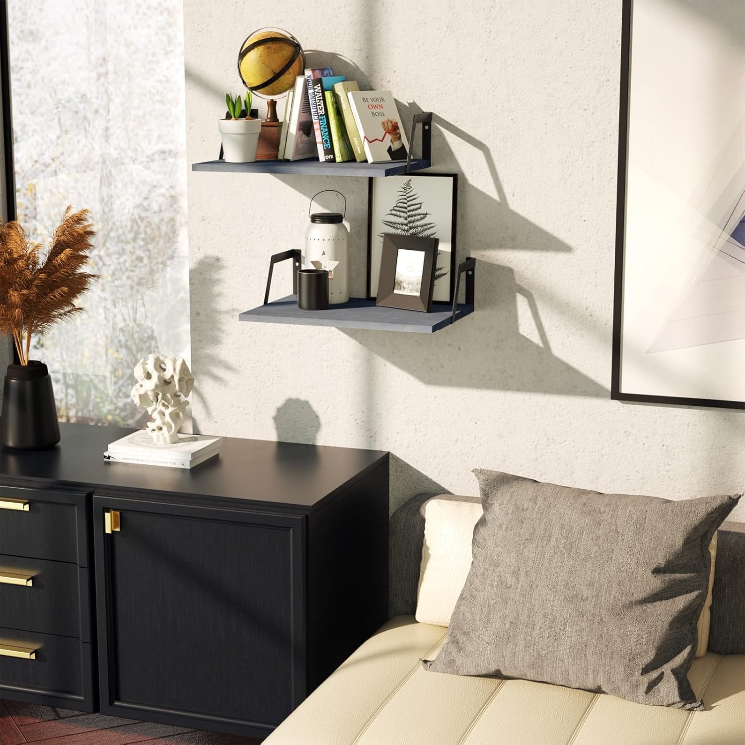 - Rustic Floating Shelves: The 2-set wall shelves will add a retro style to your home decor thanks to the weathered gray wood and and industrial metal brackets.