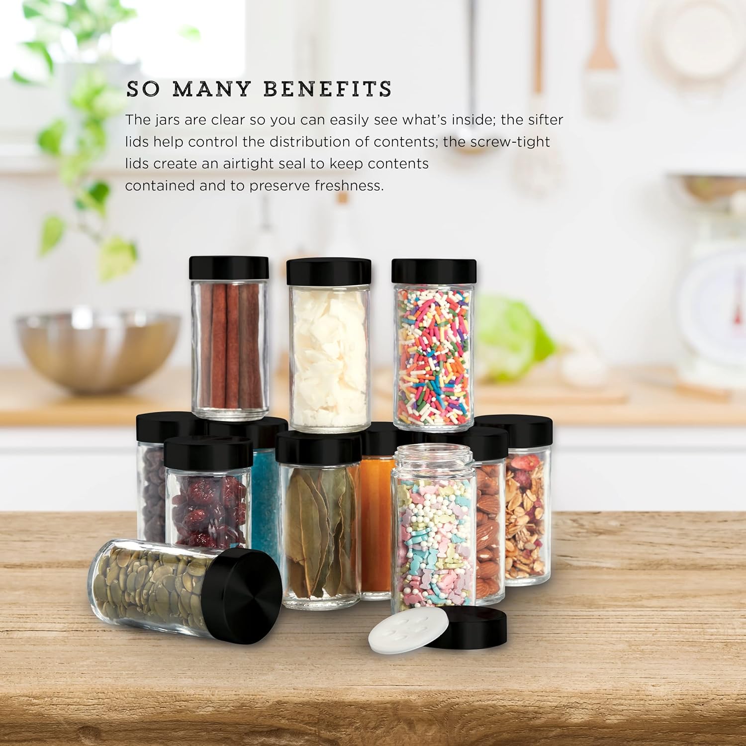 - SO MANY BENEFITS: the jars are clear so you can easily see what’s inside; the sifter shaker lids help control the distribution of contents; the screw-tight lids create an airtight seal to keep contents contained and to preserve freshness