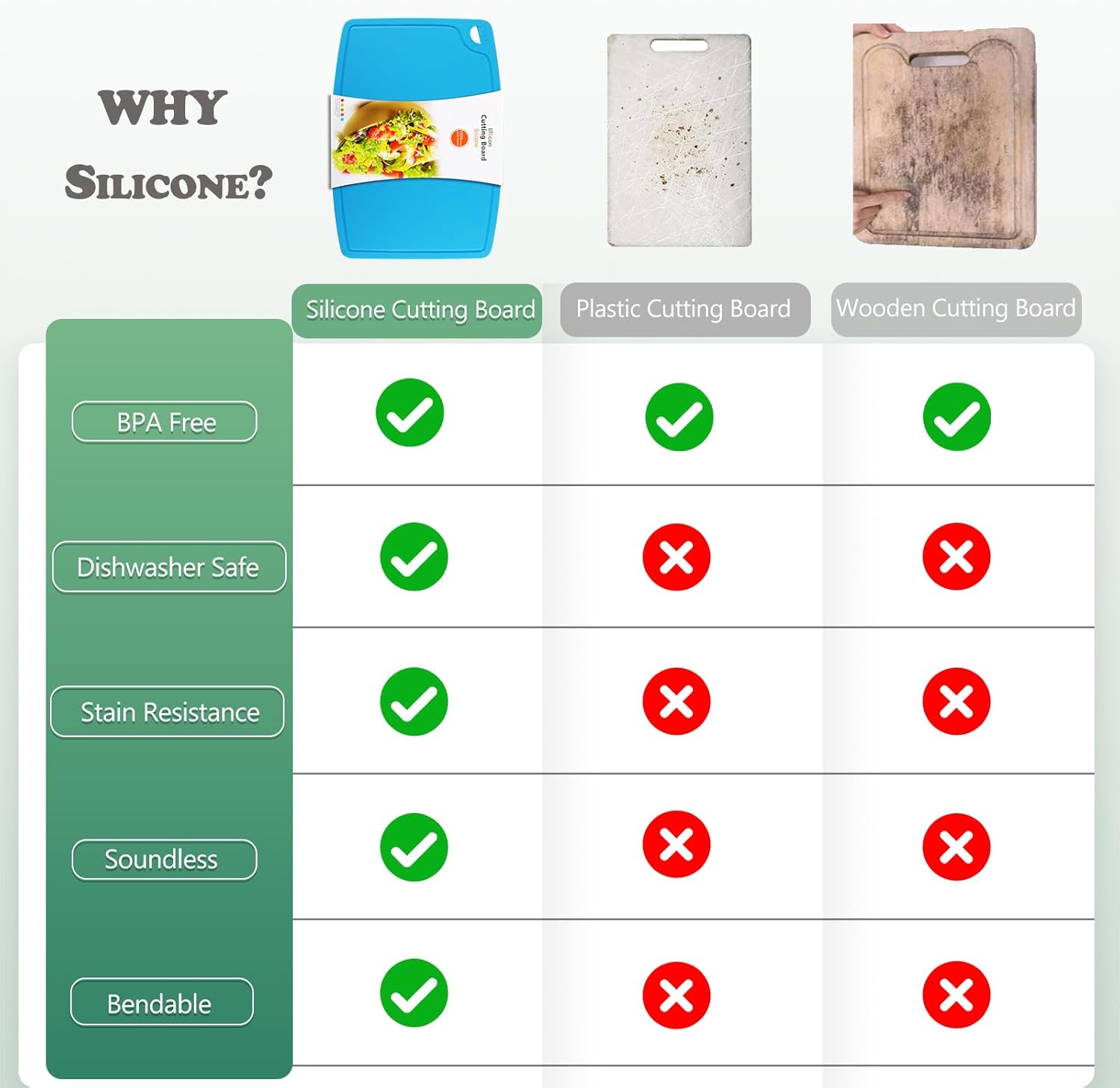 - 【HEALTHY &SAFE】: Certificated food safe Food-Grade Silicone. Heat resistant -40°F to 482°F(-40°C to 250°C) ,our silicone cutting boards and mats made from premium quality silicone is non-slip, heat proof and dishwasher safe.