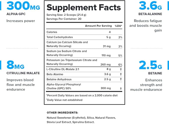 - Clean non stim pre workout with a transparent label that shows exactly what’s in every serving of our caffeine free pre workout powder and what’s not (no proprietary blends or hidden ingredients).