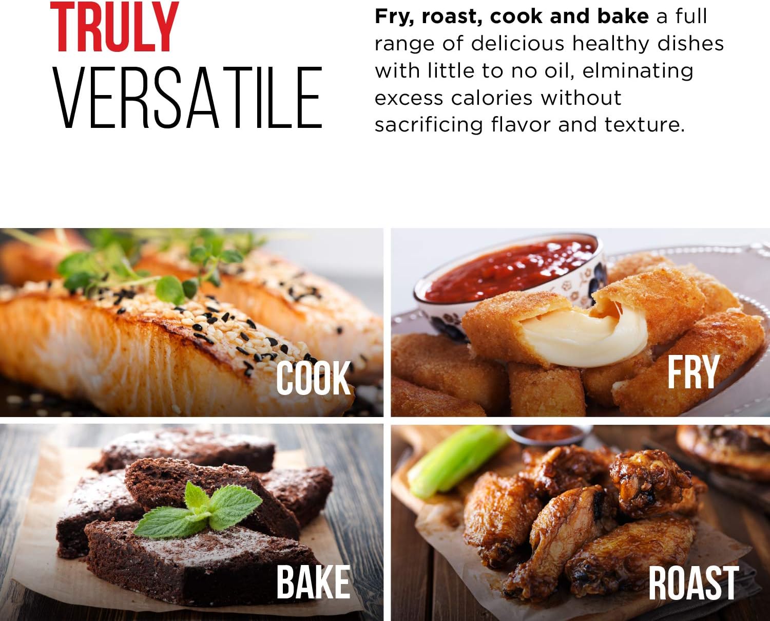 - HEALTHIER FRYING: This air fryer makes healthy fried foods a reality. Temperature range from 200-400 F allows you to cook at your desired temperature, achieving a healthy, crispy, fried finish using at least 98 percent less oil than traditional fryers. Air fry vegetables, pizza, frozen foods and leftovers – this air fryer evenly crisps every inch of your food