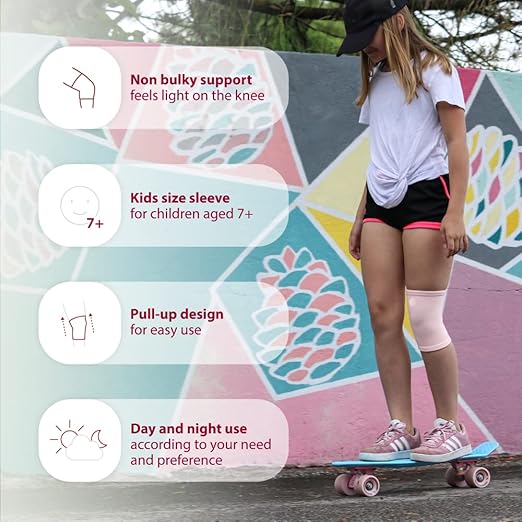 - KARM Light Pink Kids Knee Sleeve is suitable for children from the age of 7 and comes in one size which makes shopping easy for parents. Kids knee support brace offers medium-level support. Use for different sports, minor ligament injuries, instability, twisted knee, tendonitis pain, torn meniscus, and swelling.