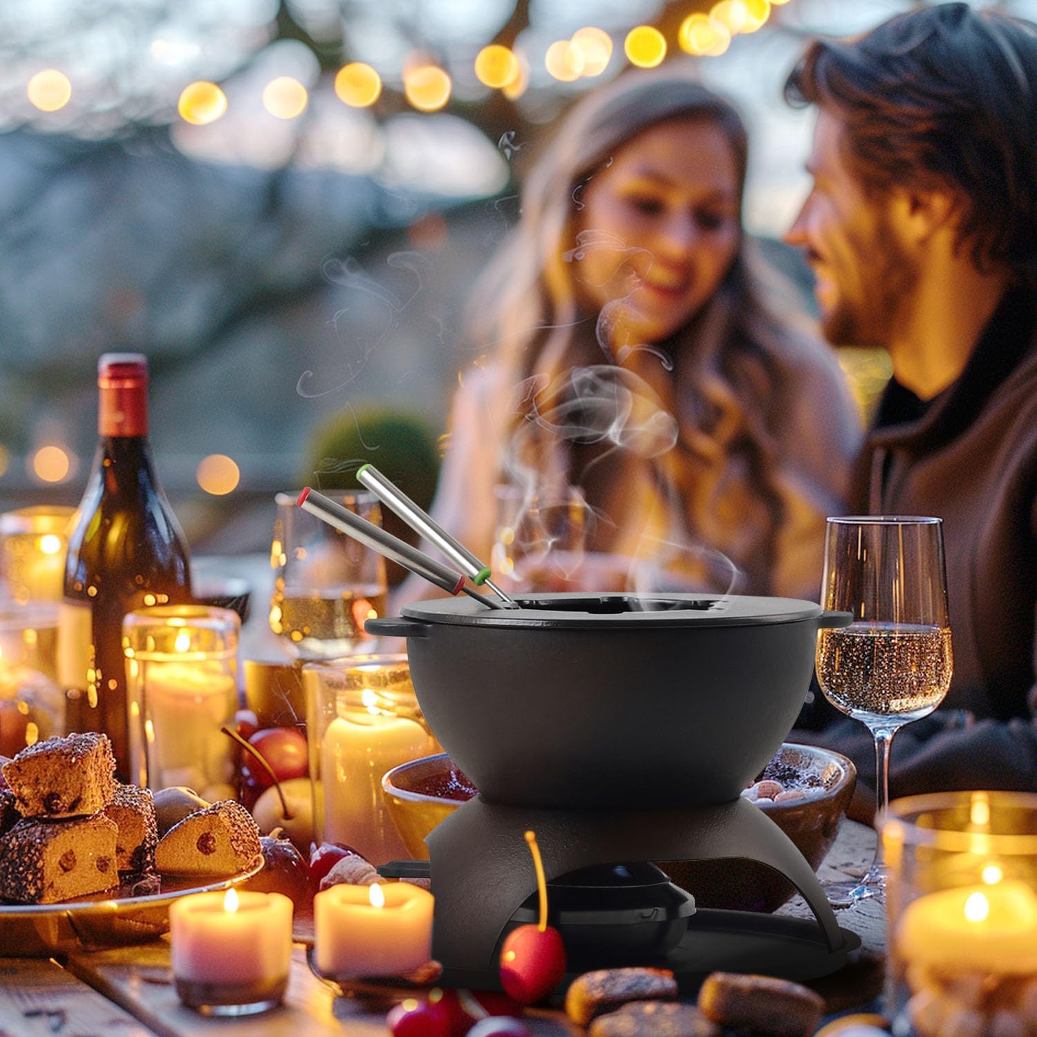 Artestia 5-Cup Cast Iron Fondue Pot for Chocolate, Cheese Fondue Pot with 6 Colored Forks for Fondue Party, 4-6 Person, Black