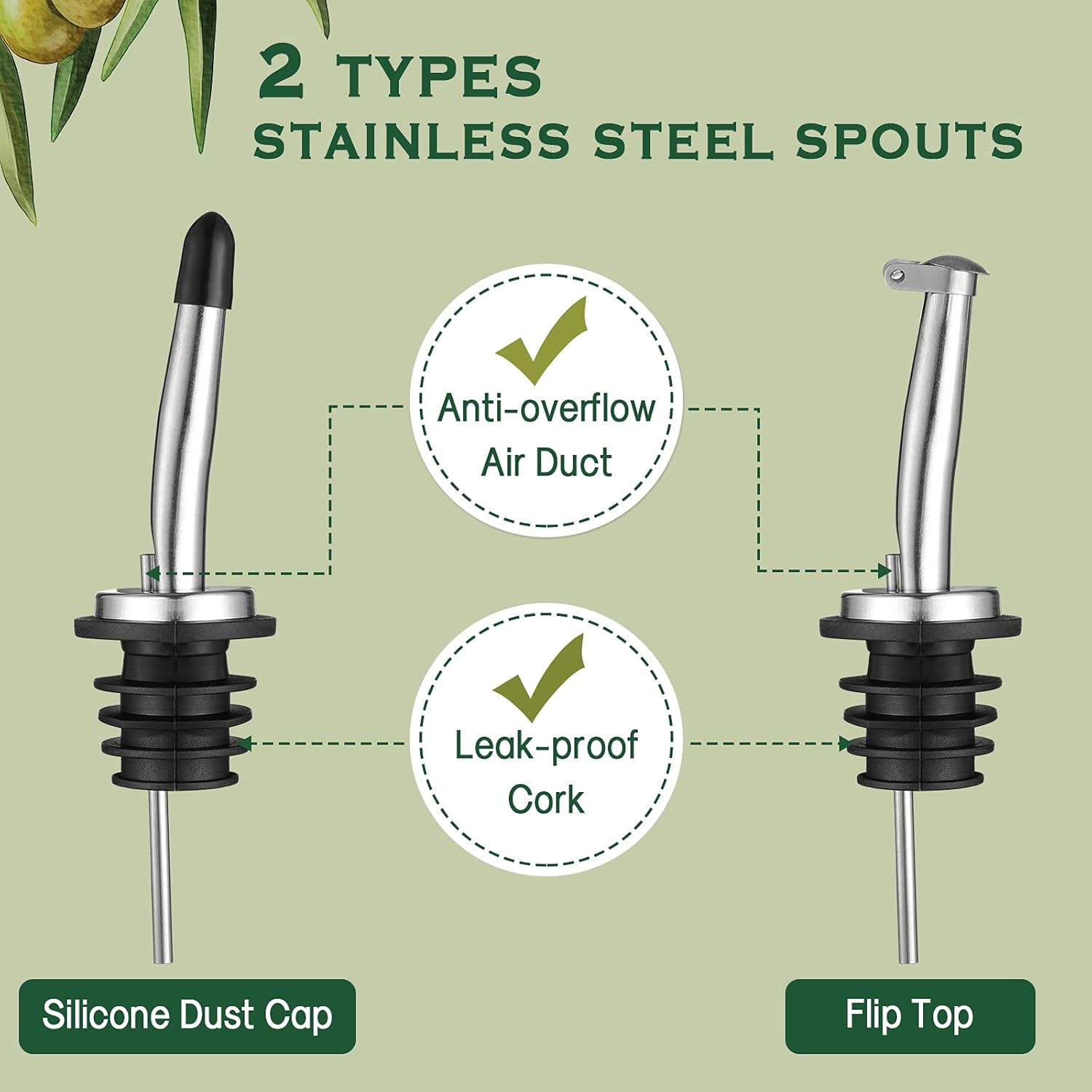 - NON-DRIP DESIGN - 18/8 Stainless steel pour spouts with sealed cap and flap cap fit the bottle well and perfectly keep dust out. Everyone can pour and dispense oil with a nice stream without leakage. Ideal for dispensing cooking oils, dressings and vinegar.