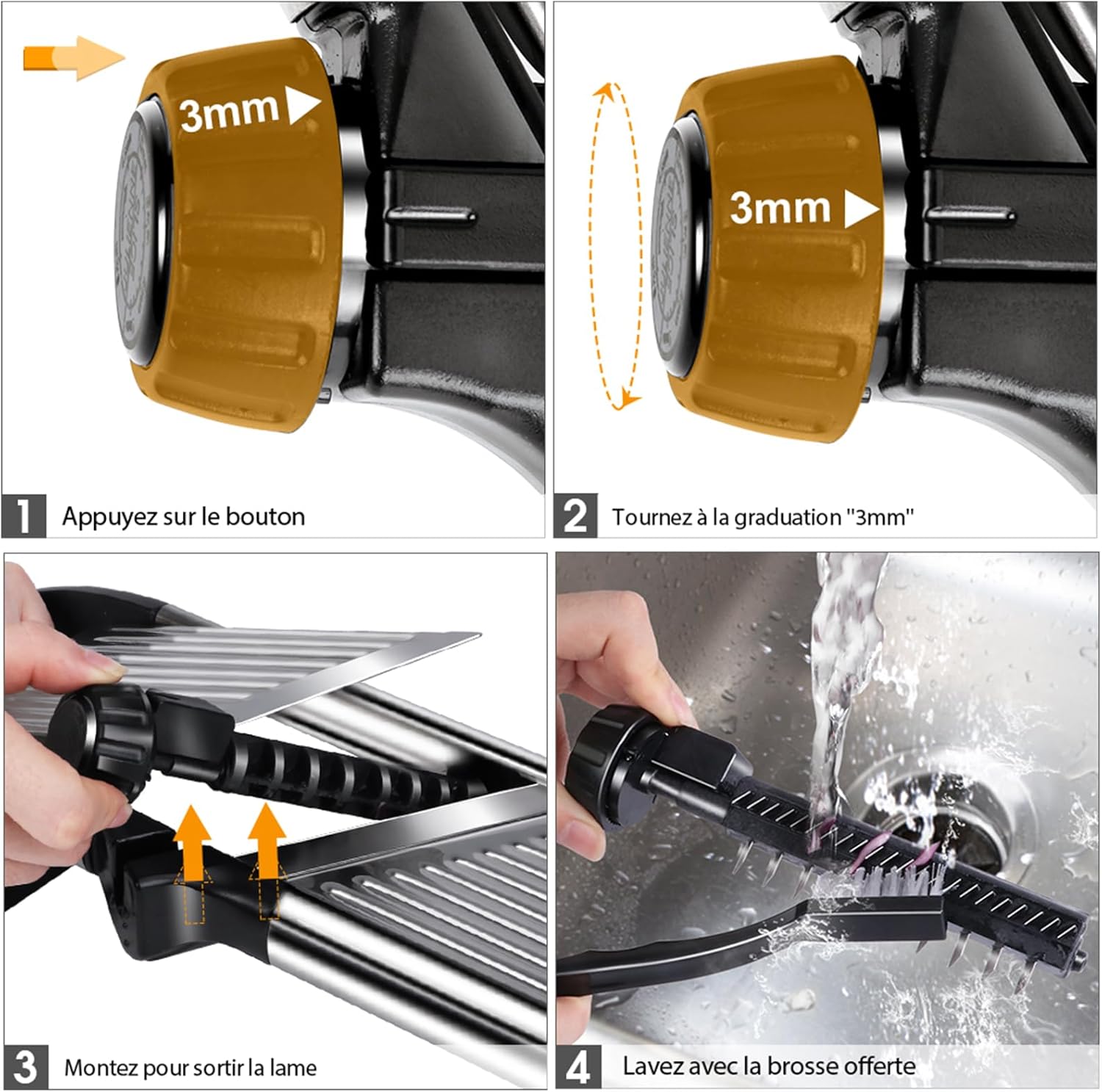 - Safe to Use:The pusher protect your hands from damaged when you using mandolin slicer. Non-slip handle and feet fit perfectly on a smooth surface, avoid any damage during operation and make cooking safety. Just put the mandoline in the sink to easily clean with water. Send an extra cut resistant glove and cleaning brush.