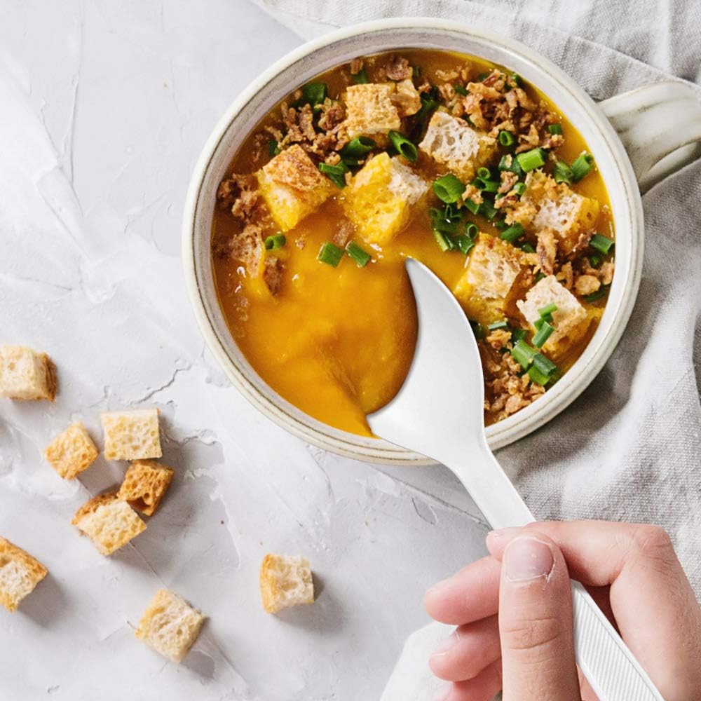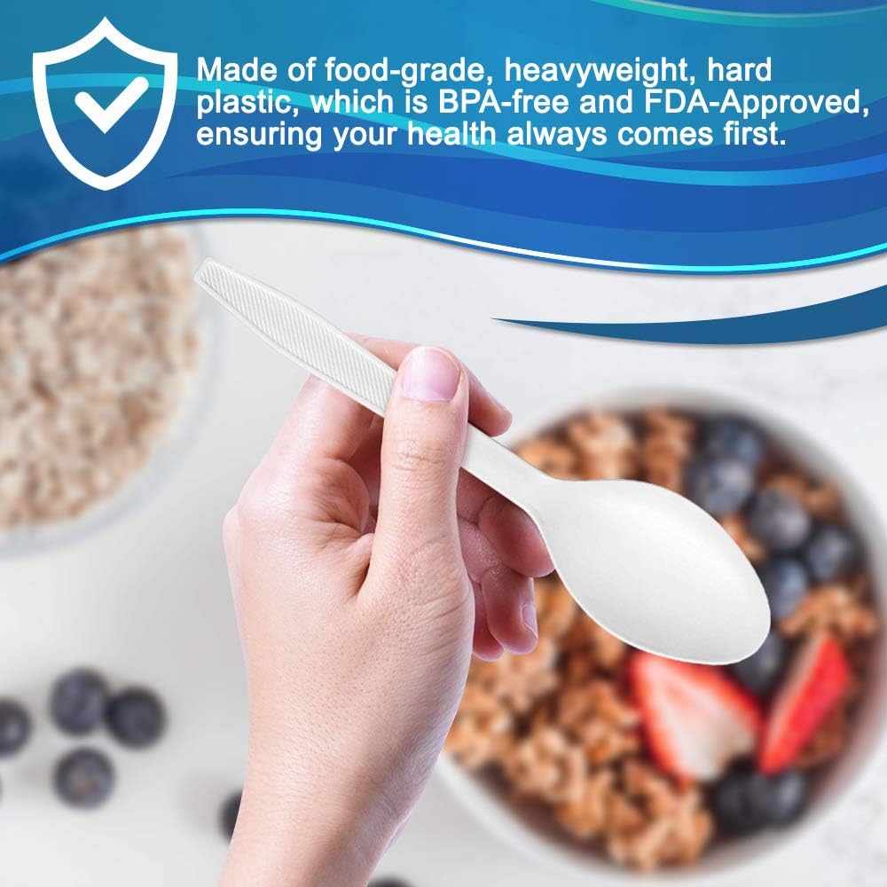 - EXTRA HEAVY WEIGHT CONSTRUCTION: Heavy duty, disposable, plastic Soup Spoons. The heavyweight plastic construction is made of food-grade plastic that is very sturdy, and ideal for solid foods like steaks, salads, fish, corn and more.