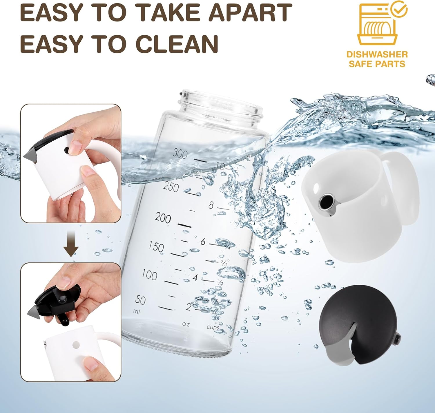 - Large Capacity and High Quality Material - Up to 10oz(300ml) large capacity,the scale on the bottle is easy to read.Food grade material, white color PP cap,red lid-spout and glass bottle.