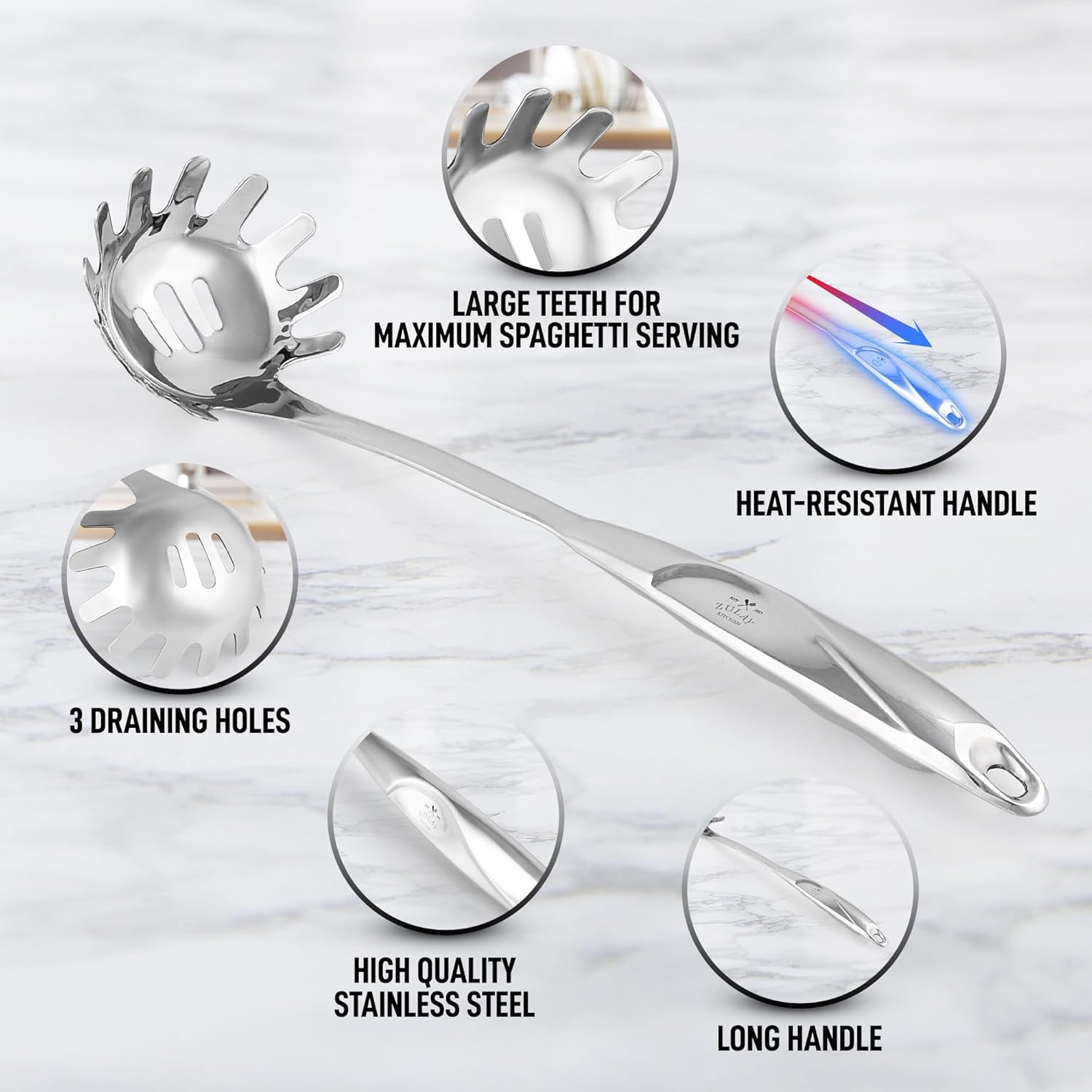 - VERSATILE TOOL: We have carefully crafted this spaghetti spoon with a heat-resistant handle that will not bend, melt, or deform and will also prevent your hands from burning when exposed to heat for a longer period. Use this pasta strainer spoon for stirring or serving spaghetti, fettuccine, penne, fusilli, and ravioli or for taking boiled eggs or dumplings out of the pot.