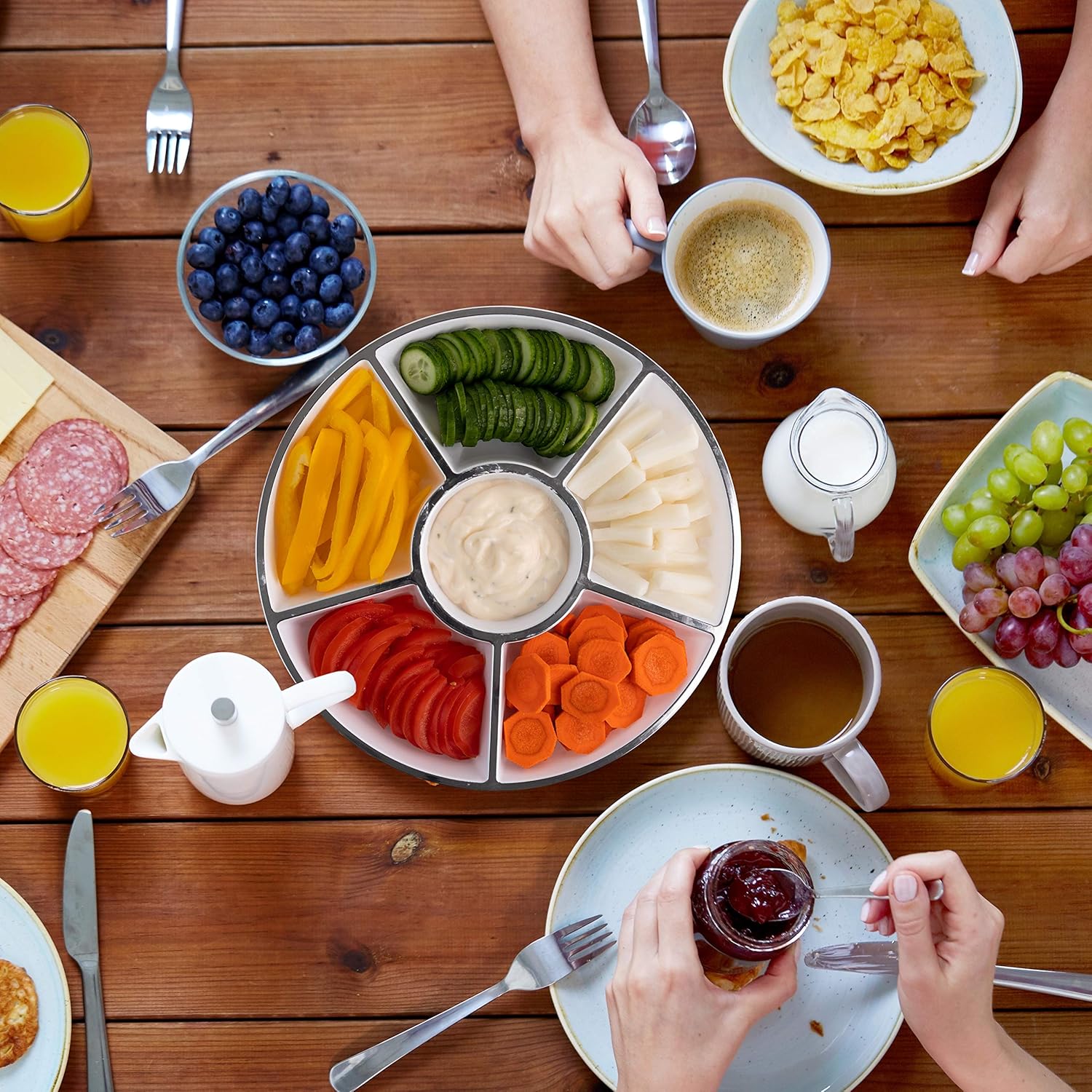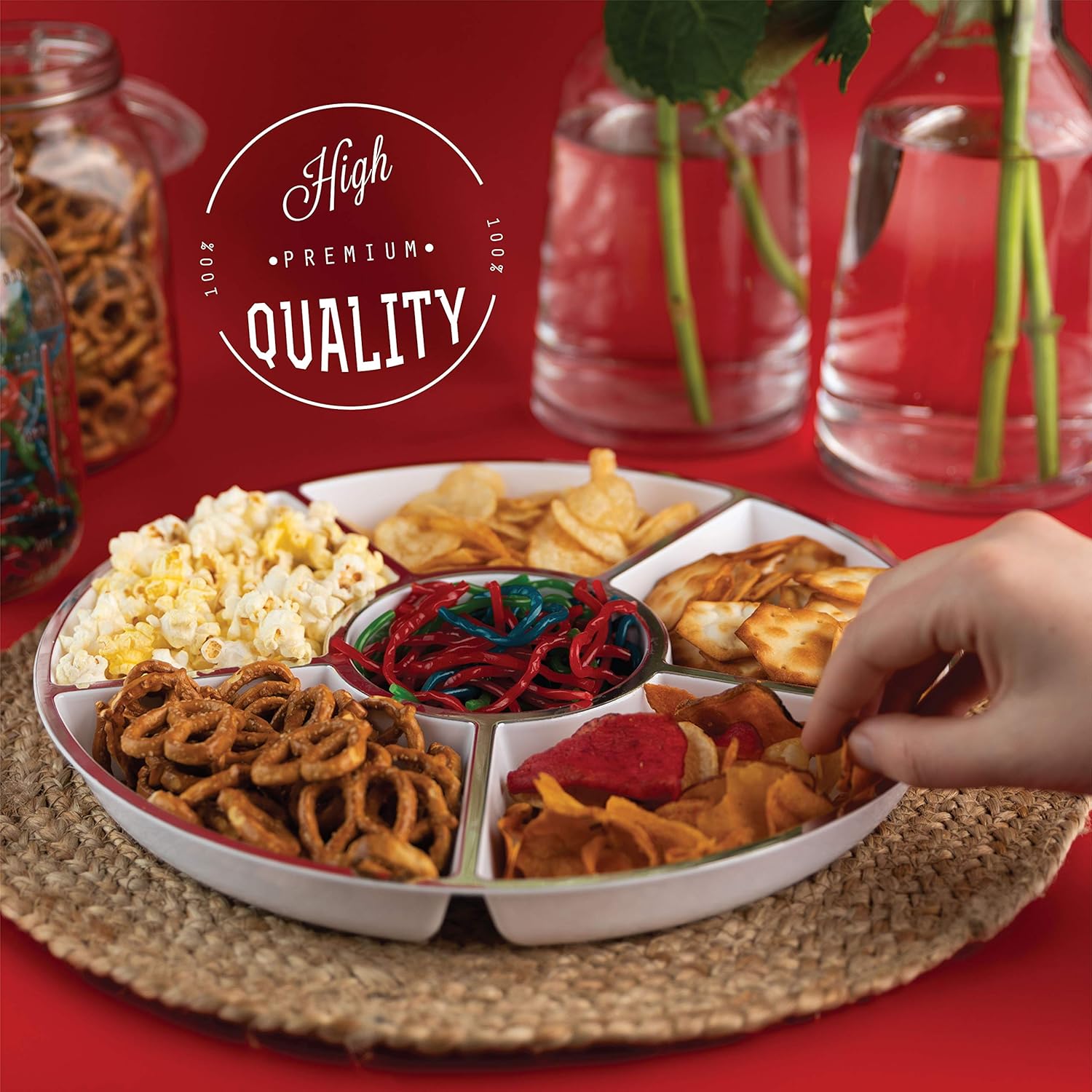 - SIZE 12” round serving plate consists of 6 divided sections with a center dip section which is excellent for serving snacks and appetizers. Its each section are amply sized for chips and salsa, veggies and dip, shrimp and cocktail sauce and much more