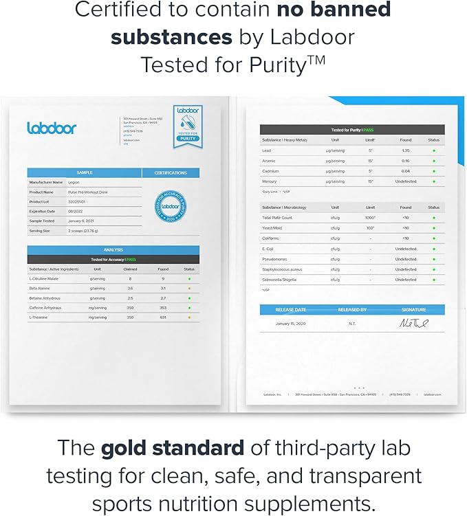 - Tested for purity and potency in an ISO 17025 accredited third-party lab, and independently certified to contain no contaminants or banned substances by Labdoor. Every bottle of our Pulse pump pre workout is guaranteed to provide exactly what the label claims and nothing else.