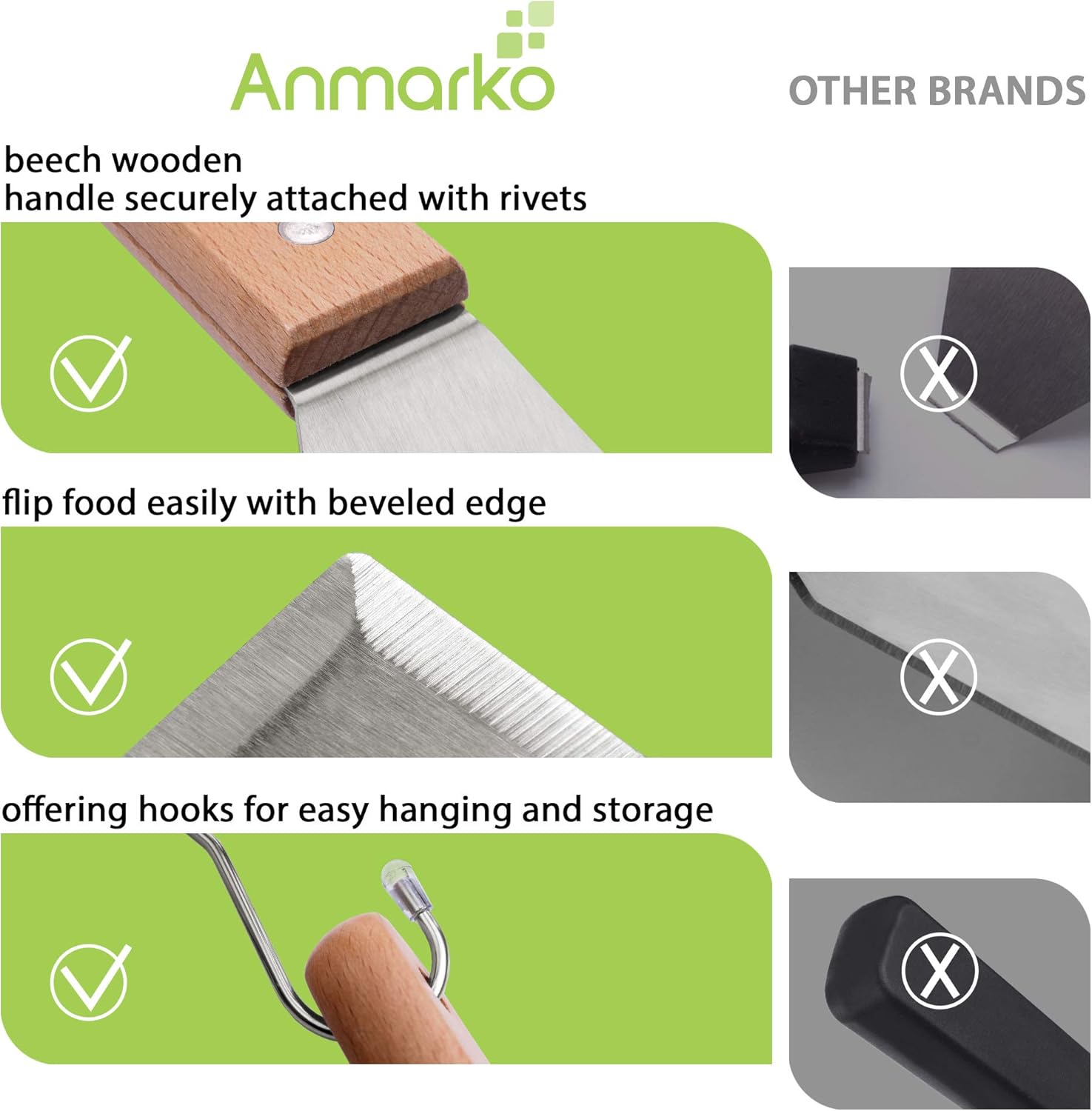 - ✅ FIRM GRIP - ergonomic and comfortable foodsafe beech wooden handle with hole and 2 hooks for easy hanging. Handle securely riveted with a rivets. Flat spatula and stainless steel turner are very well balanced . Metal spatula set is handwash only. Whipe spatulas dry after washing.
