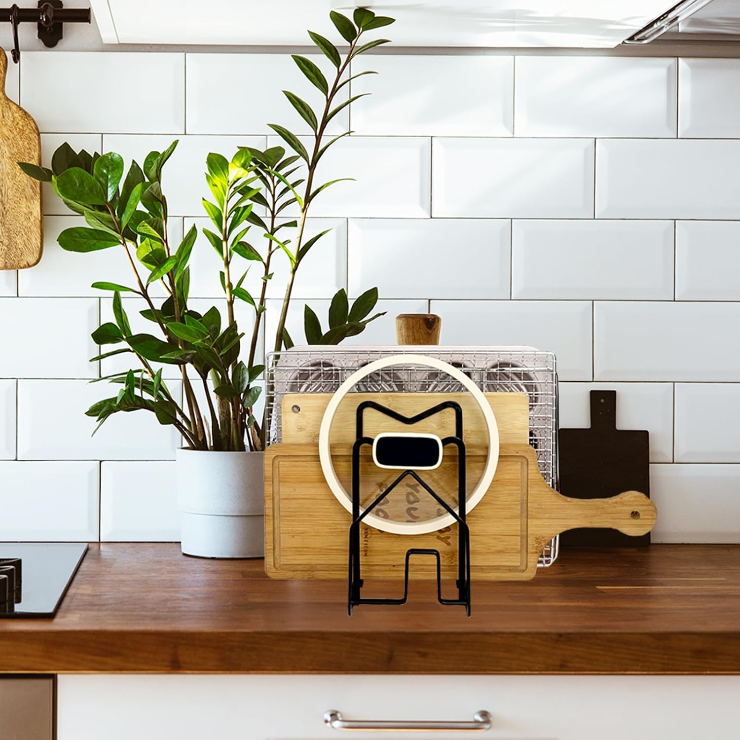 - CUTTING BOARD RACK FLEXIBLE USES: you can use it to store your cutting board, chopping board, lids of your kitchen essentials, plates, cookie sheets, muffin tins, shovels, spoons, and recipe books and so on. it securely holds items and keeps them organized, keeping your space mess free.