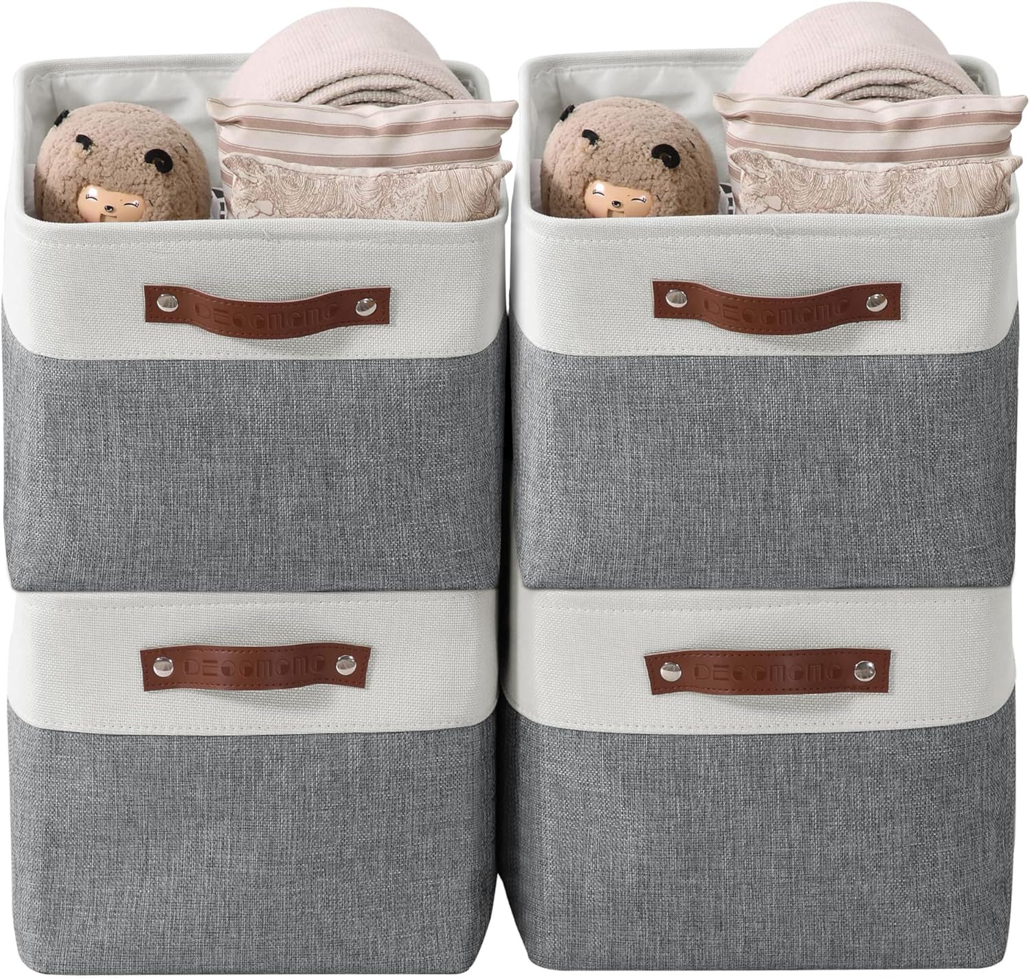 - Sturdy Construction: DECOMOMO closet storage bins are reinforced with upper metal frame and 2.5mm MDF fiberboard bottom to keep the baskets upright. Comes with dual faux leather handles with the weight bearing capacity of 25 lbs.