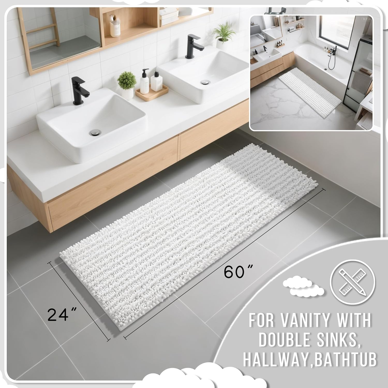 Yimobra Bathroom Runner Rug 60x24 Inch - Extra Long Non Slip Chenille Bath Mat, Soft & Absorbent, Machine Washable Shaggy Hallway Carpet for Vanity Tub Shower, White Home Decor Accessories