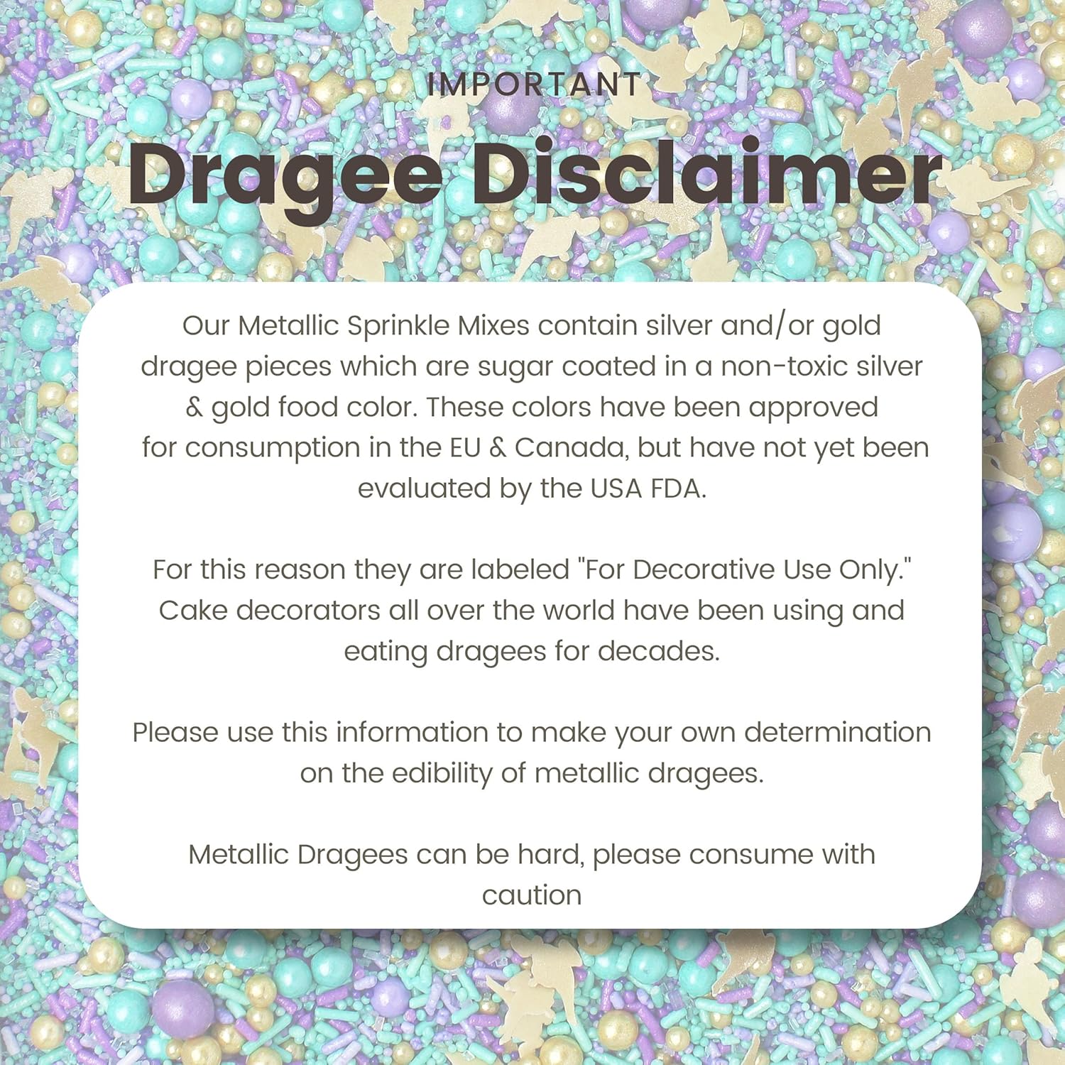 - Metallic Dragees Disclaimer: Silver and gold dragees are commonly used by cake decorators worldwide. While approved for consumption in some regions, they are traditionally labeled as “For Decorative Use Only” in the U.S. Please use discretion when adding them to your creations