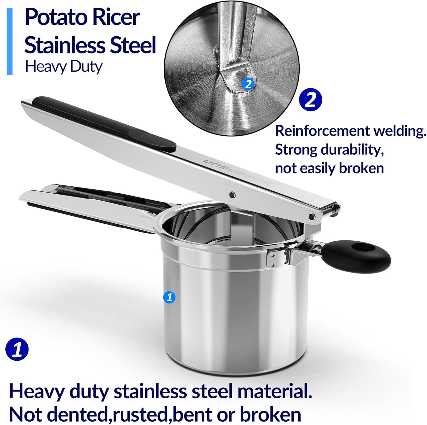 - 【Heavy Duty Stainless Steel Potato Masher】100% Heavy duty potato ricer stainless steel resists staining, corrosion and deformation. So it will not dented, rusted, bent or broken. Reinforced welded ricer for mashed potatoes makes it stronger and long-lasting.