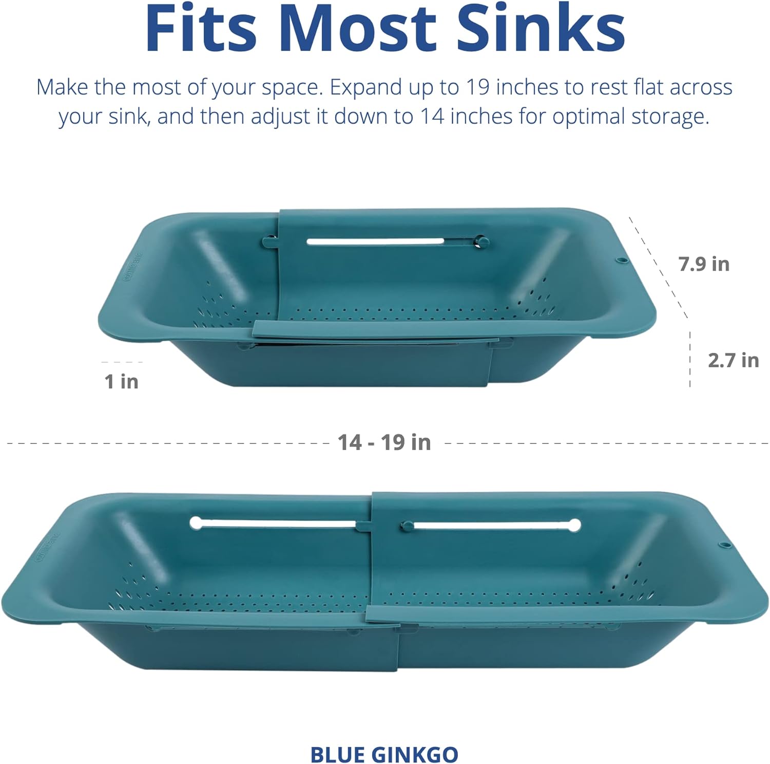 BLUE GINKGO Over the Sink Colander Strainer Basket - Wash Vegetables and Fruits, Drain Cooked Pasta and Dry Dishes - Extendable - New Home Kitchen Essentials (7.9 W x 14.5-19.5 L x 2.75 H) - Teal