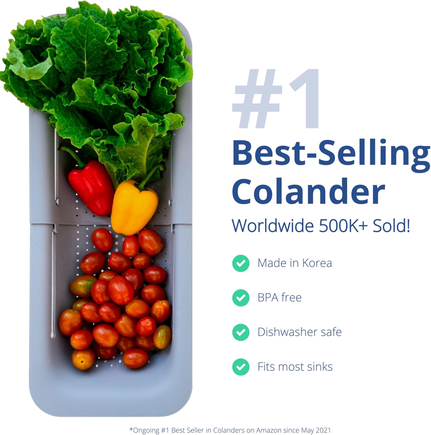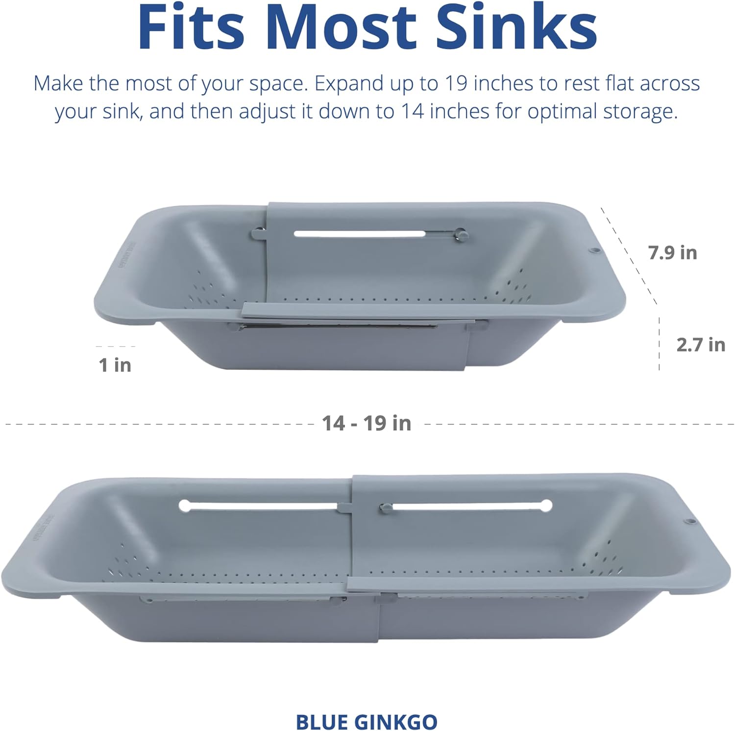 BLUE GINKGO Over the Sink Colander Strainer Basket - Wash Vegetables and Fruits, Drain Cooked Pasta and Dry Dishes - Extendable - New Home Kitchen Essentials (7.9W x 14-19L x 2.75H) - Gray