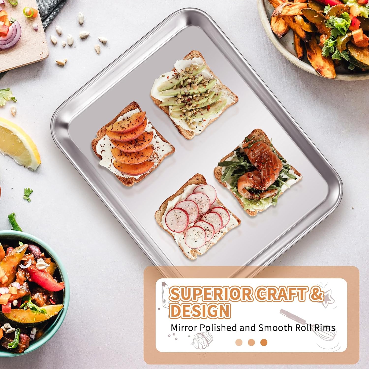 - π πππππππππππ & πππππππ: Our stainless cookie sheet set features its solid construction and feel sturdy enough when holding in hands, nice weight to cook with, rust resistant, high hardness, no distortion, no worries about bending, durable to use for years.