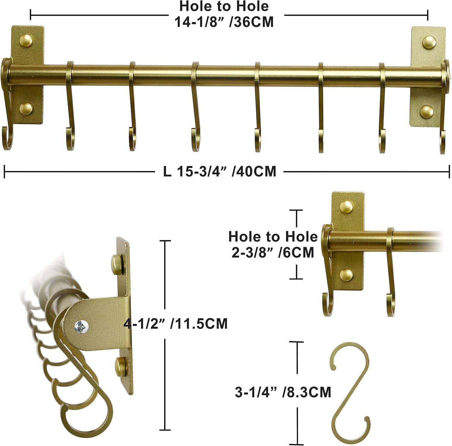 - Sizes(CM): 40 Lx 11.5 H x 4.2W deep; Bronze color, 1 x pots and pans rack with 8 hooks