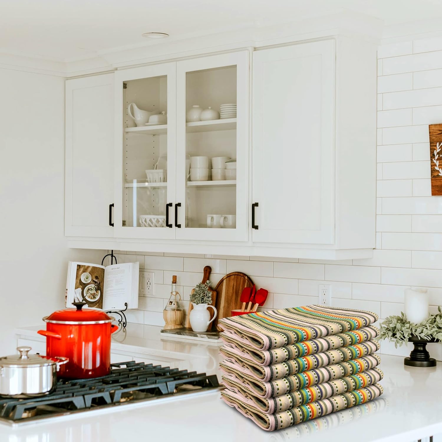 Urban Villa Easter Kitchen Towels,Beige Multi Dobby Stripes,Premium Quality,100% Cotton Dish Towels, Mitered Corners,Ultra Soft (Size: 20x30 Inches), Highly Absorbent Bar & Tea Towels (Set of 6)