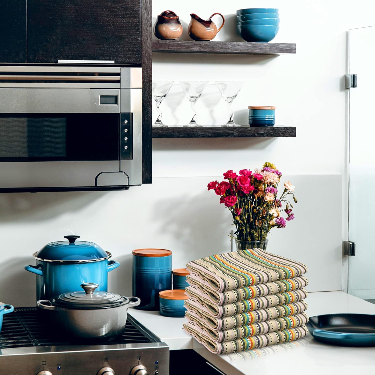 - Set of 6 Kitchen Towels Made from 100% Cotton. These premium quality dish towels are highly absorbent and dry quickly in order to avoid any bacterial build-up