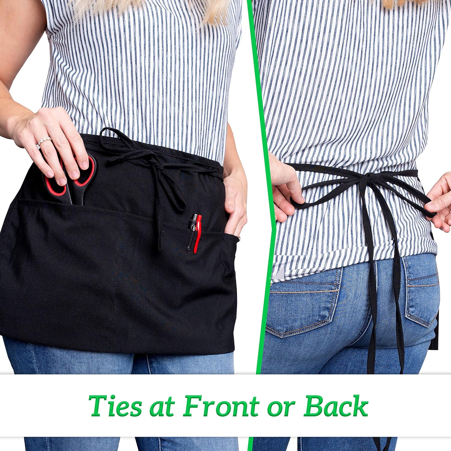 - 3 Pack Black Waist Aprons For Men And Women: The GREEN LIFESTYLE half apron for waiters and waitresses is made of commercial grade 100% Spun Polyester fabric to offer a durable, tough, tear-resistant and stain-resistant surface. Each aprons with pockets is specifically made to meet industrial grade standards so it is made to last and Machine Washable and will last you!