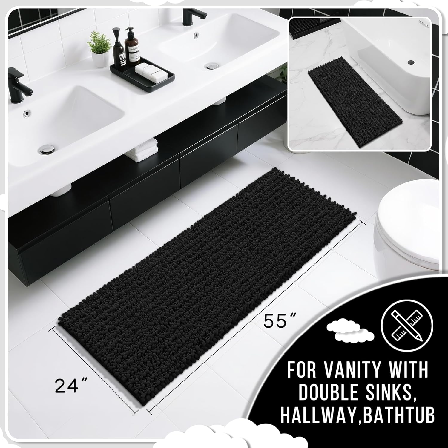 Yimobra Bathroom Runner Rug 55x24 Inch - Extra Long Non Slip Chenille Bath Mat, Soft & Absorbent, Machine Washable Shaggy Hallway Carpet for Vanity Tub Shower, Black Home Decor Accessories