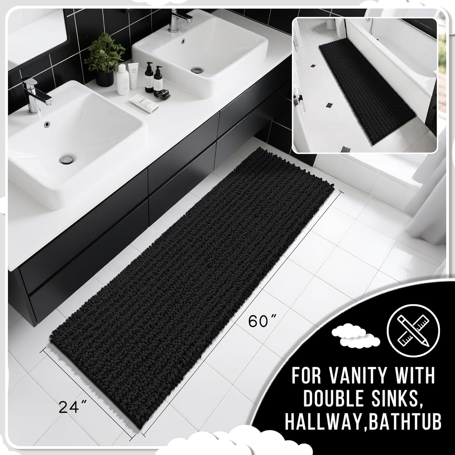 Yimobra Bathroom Runner Rug 60x24 Inch - Extra Long Non Slip Chenille Bath Mat, Soft & Absorbent, Machine Washable Shaggy Hallway Carpet for Vanity Tub Shower, Black Home Decor Accessories