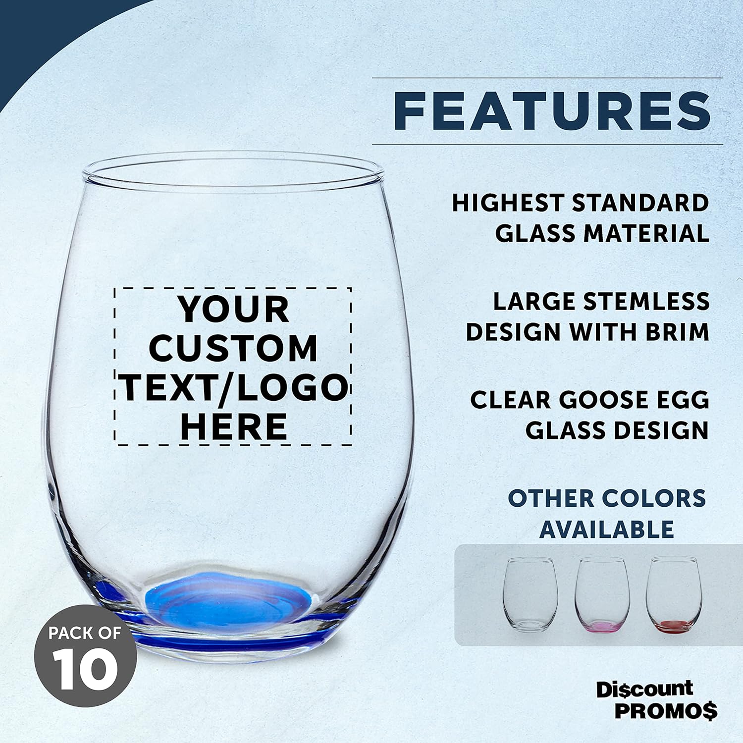 Custom Stemless Wine Glasses in Bulk by ARC Perfection, 15 oz, 10 pack, Personalized Text, Logo, Red or White Wine Glass Set, Blue