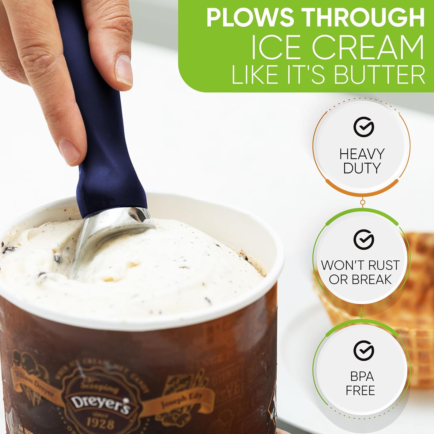 - Plows Through Ice Cream Like It's Butter - Glides smoothly and easily through hard-packed frozen sweets. It will seem like ice cream flows right into the scoop and drops into your bowl or cone with little to no effort.