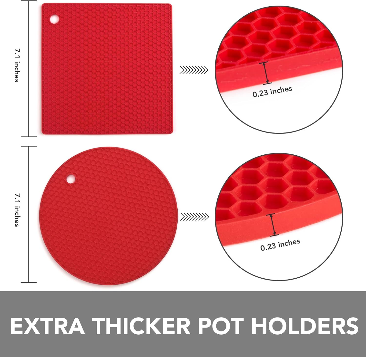 - CIRCLE AND SQUARE SILICONE POT HOLDER: Protect your hands, pans, and countertops with our large professional silicone trivet pack that includes 2 round and 2 square honeycomb silicone trivets, available in black, red, gray.