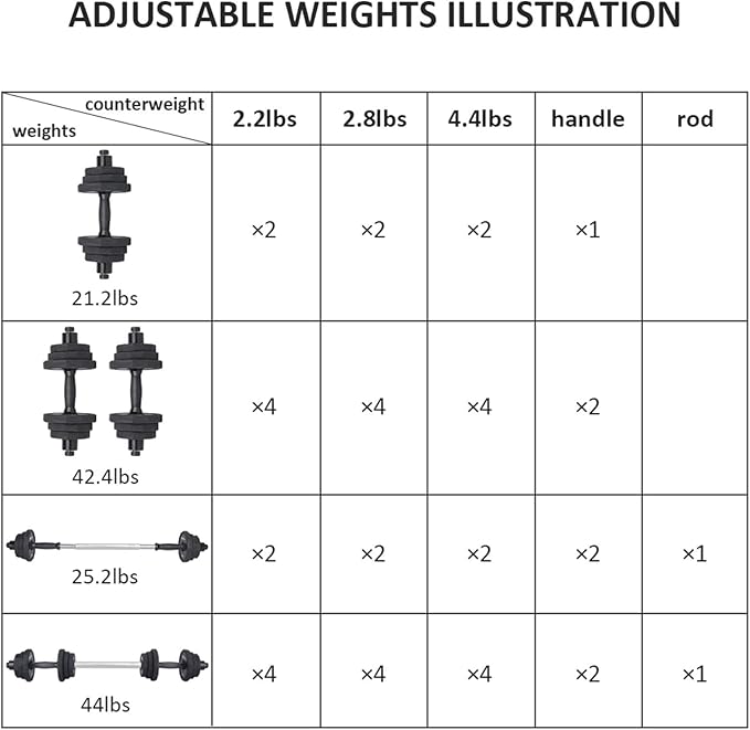 - More Adjustable Weights Dumbbells Set Options: With a wide range of weights from 6.8lbs to 44lbs, these dumbbell set can be assembled as a barbell, allowing you to adjustable your weight to meet your training needs.Fitness dumbbells sets for women men.