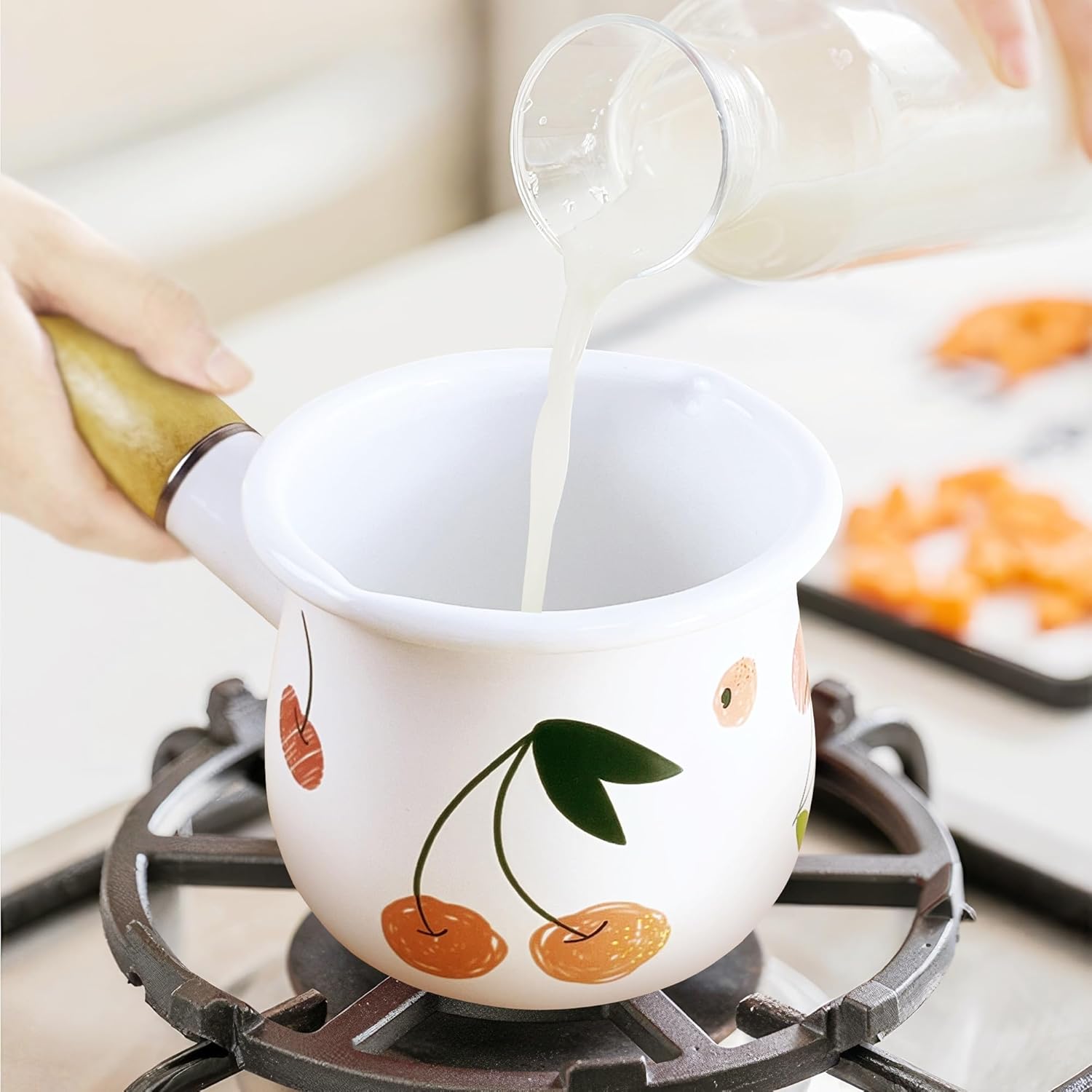 Enamel Milk Pot, Small Saucepan Butter Warmer 4 Inch 17 Oz with Wooden Handle for Heating Smaller Liquid Portions