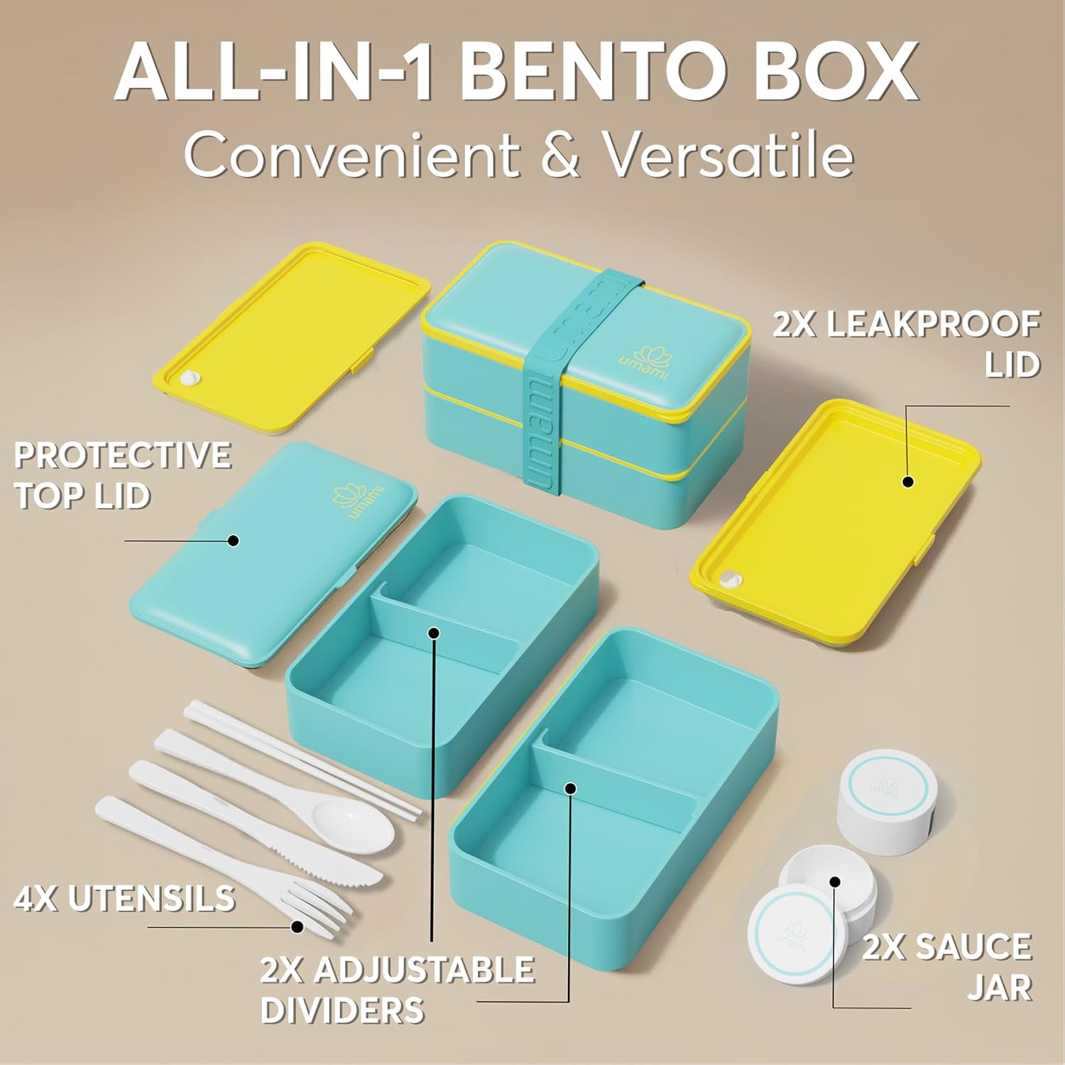 Umami Bento Box Adult All-in-1 w/ 4 Utensils, 100% Leakproof, Dishwasher & Microwave Safe Lunch Containers for Adults w/ 4 Compartments, Fresh Turquoise, 40 oz