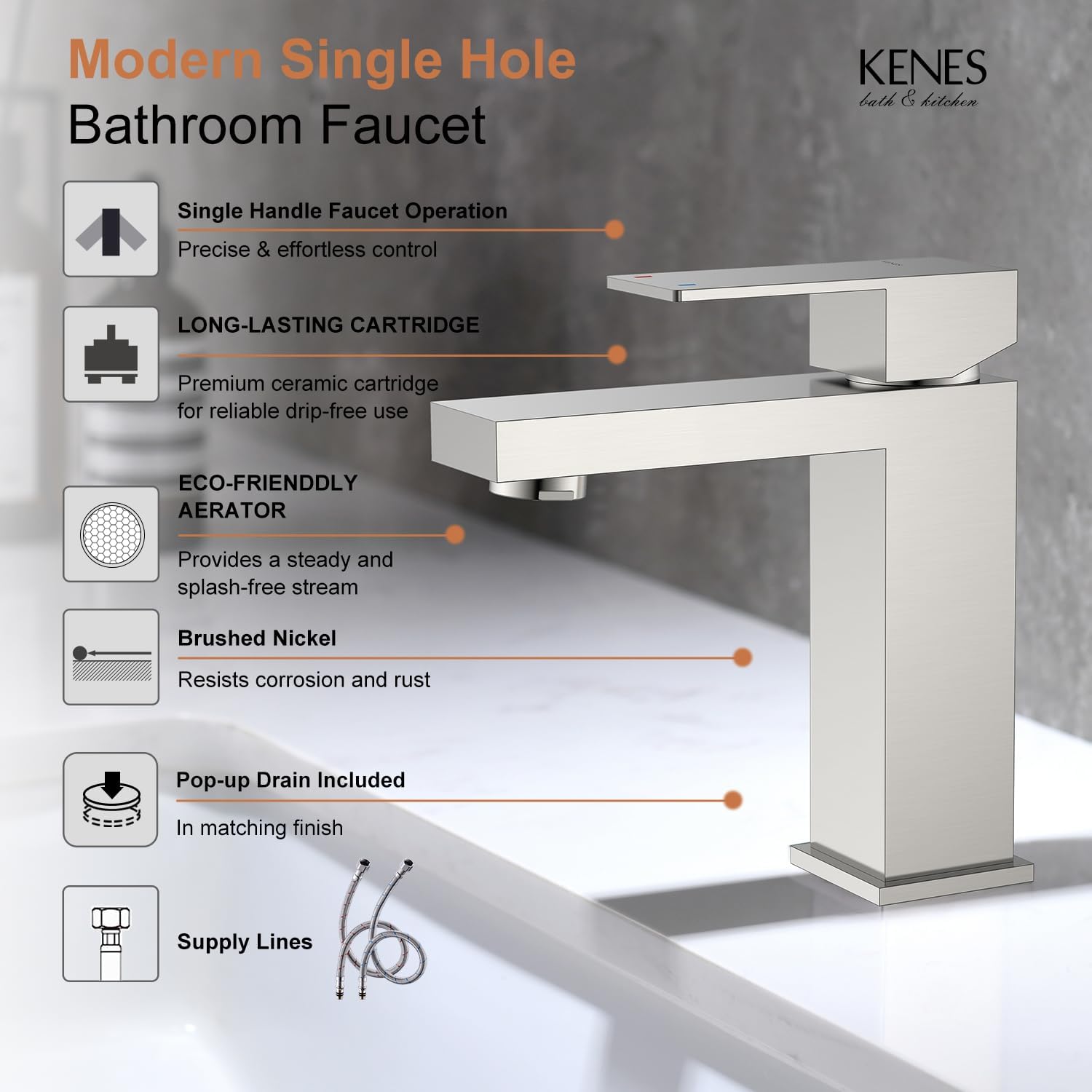KENES Single Handle Bathroom Sink Faucet, Brushed Nickel Vanity Faucet for Bathroom Sink, with Pop Up Drain Stopper & Water Supply Lines LJ-9031