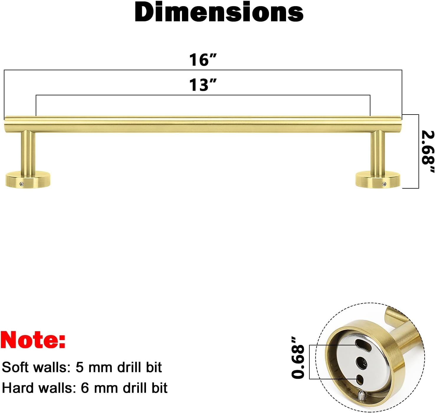 - DIMENSIONS & USE: Overall length is 16" (405mm). The length of hanging space is13" (340mm). 22-Lbs (10kgs) max weight capacity. You can mount this towel bar to either side of your cabinet or closet door for storing at-use hand and dish towels. It can also be used with S hooks, hanging bath balls, hair dryers, tea cups, spoons, clips, etc.