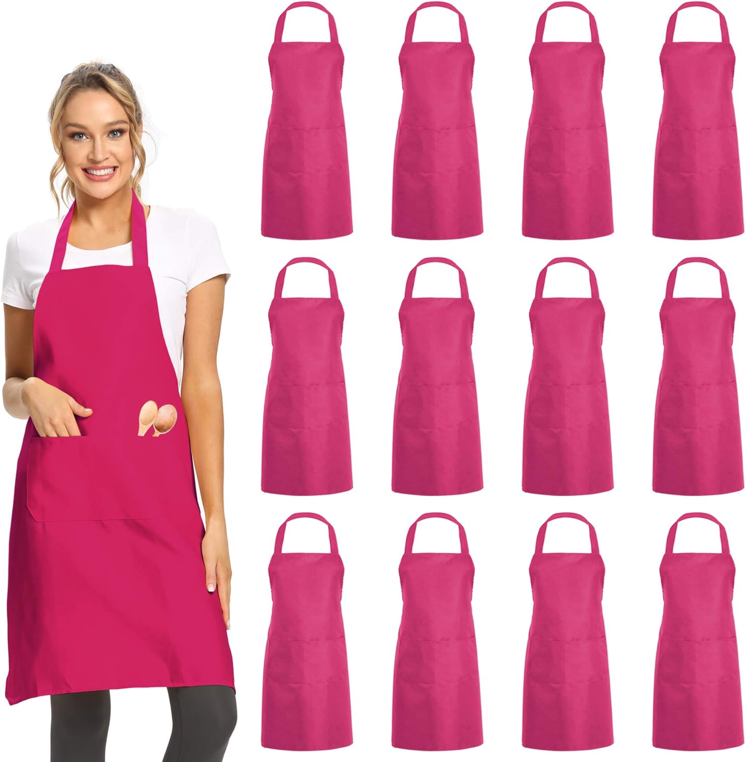 DUSKCOVE 12 Pack Plain Bib Aprons with 2 Pockets - Pink Unisex Commercial Apron Bulk for Kitchen Cooking Restaurant BBQ Painting Crafting