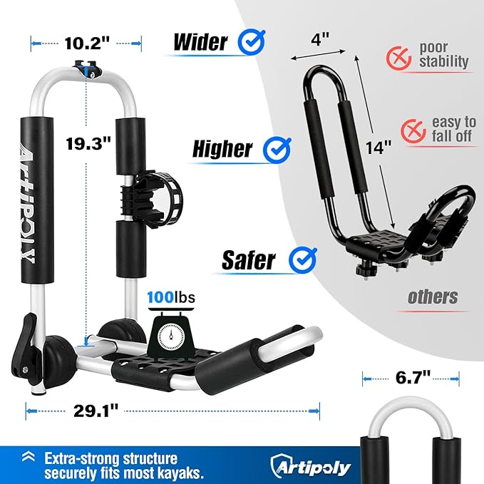 - Universal Roof Rack Meets Most of Your Needs: It can accommodates one kayak up to and 165lbs. Fits to round, oval, square, and flat crossbars from most factory. Accessories come with the rack including: two heavy-duty bow-stern safety tie-down straps, and three extra ropes brings confidence and peace of mind.