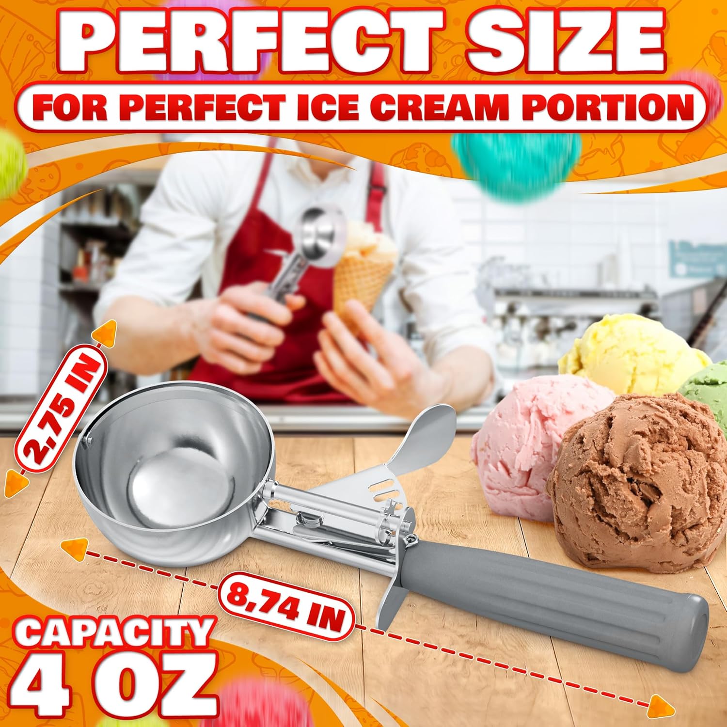 - Durable 4 oz Ice Cream Scoop. This icecream scooper stainless steel with trigger for easy release doubles as cookie scoops for baking, making portioning effortless