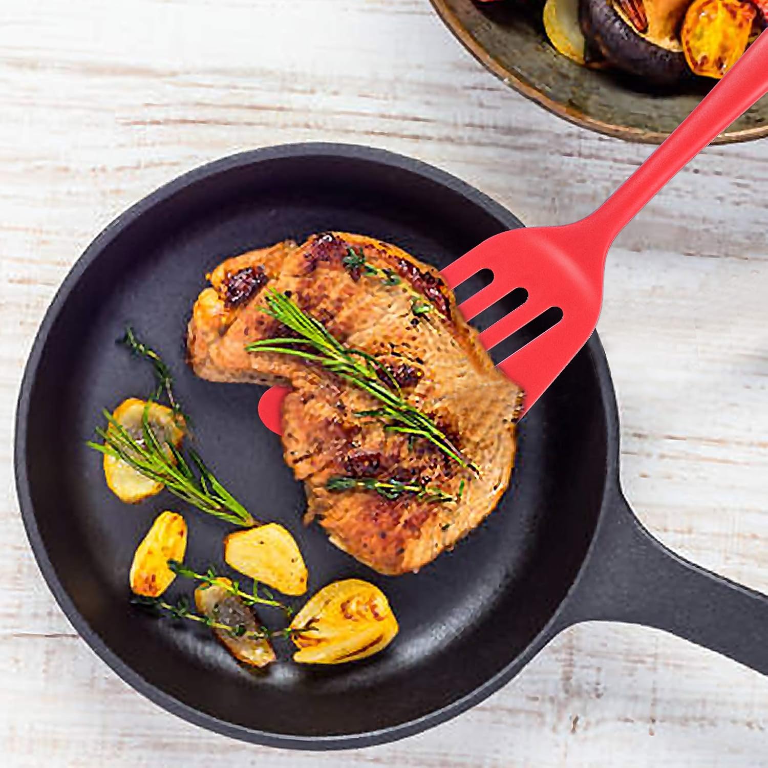 - Thoughtful Design : The wide thin but tough silicone edges make it perfect for flipping longer foods like omelets and fish filet; At the same time used for frying eggs, beef, pancake and burgers will give you unexpected surprises