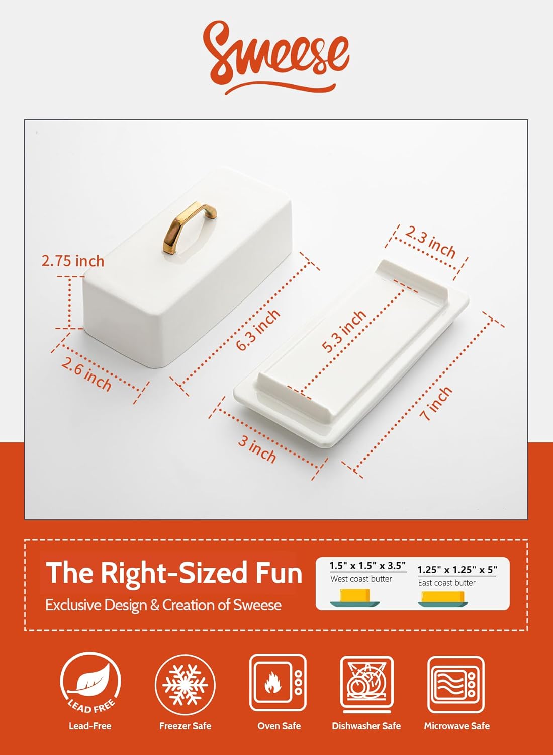 - Pro-Grade Porcelain & SAFE - These Sweese butter dish with lid is food safe, BPA-FREE and LEAD-FREE than the ugly plastic kind of butter dishes. It is made of sturdy porcelain, chip-resistant, and more sturdy than stoneware. And the lid is thick so will protect from sunlight heat.