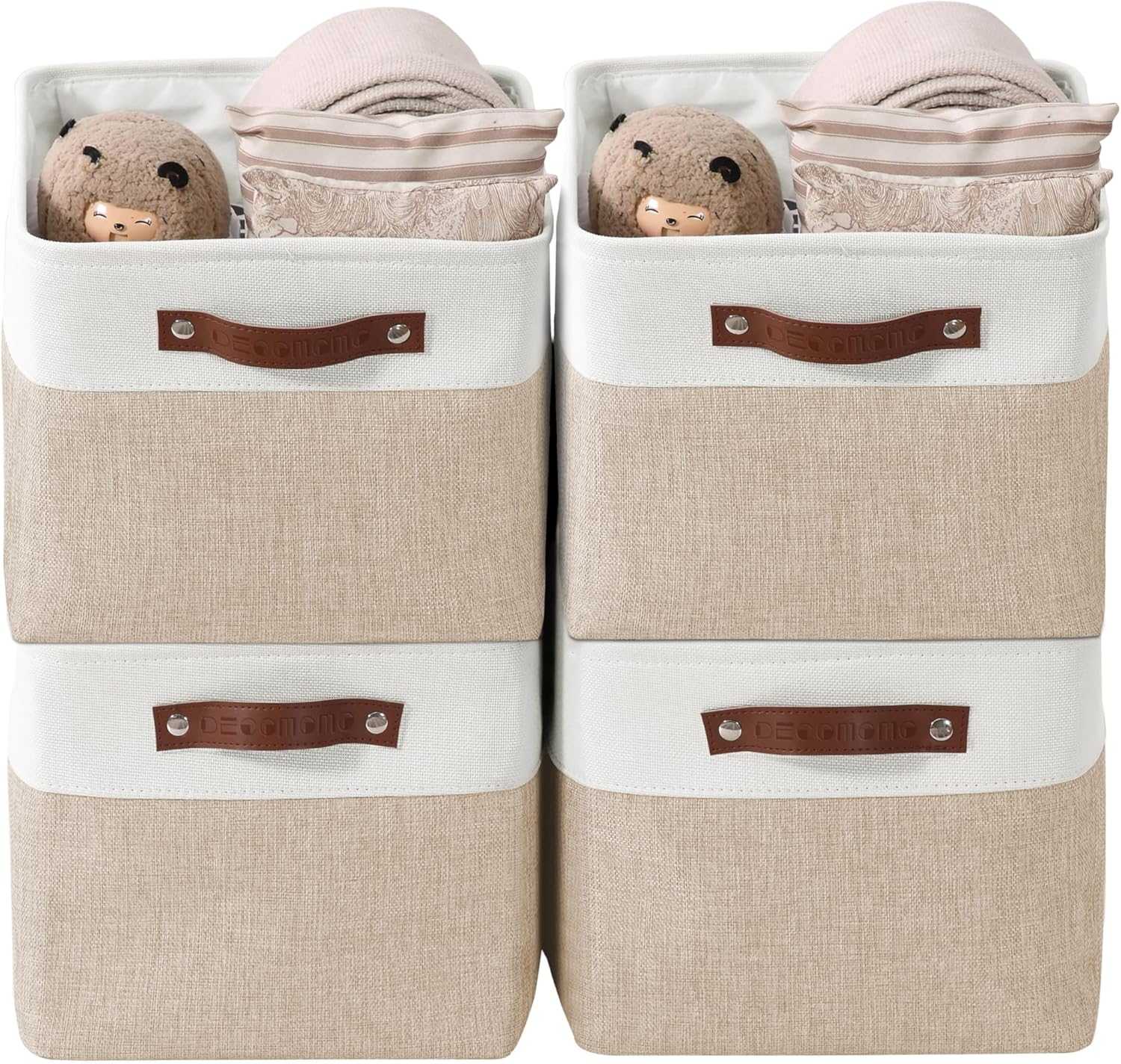 DECOMOMO Storage Baskets for Shelves - Fabric Storage Bins, Linen Closet Organizers and Storage (Beige & White, Large - 4 Pack)