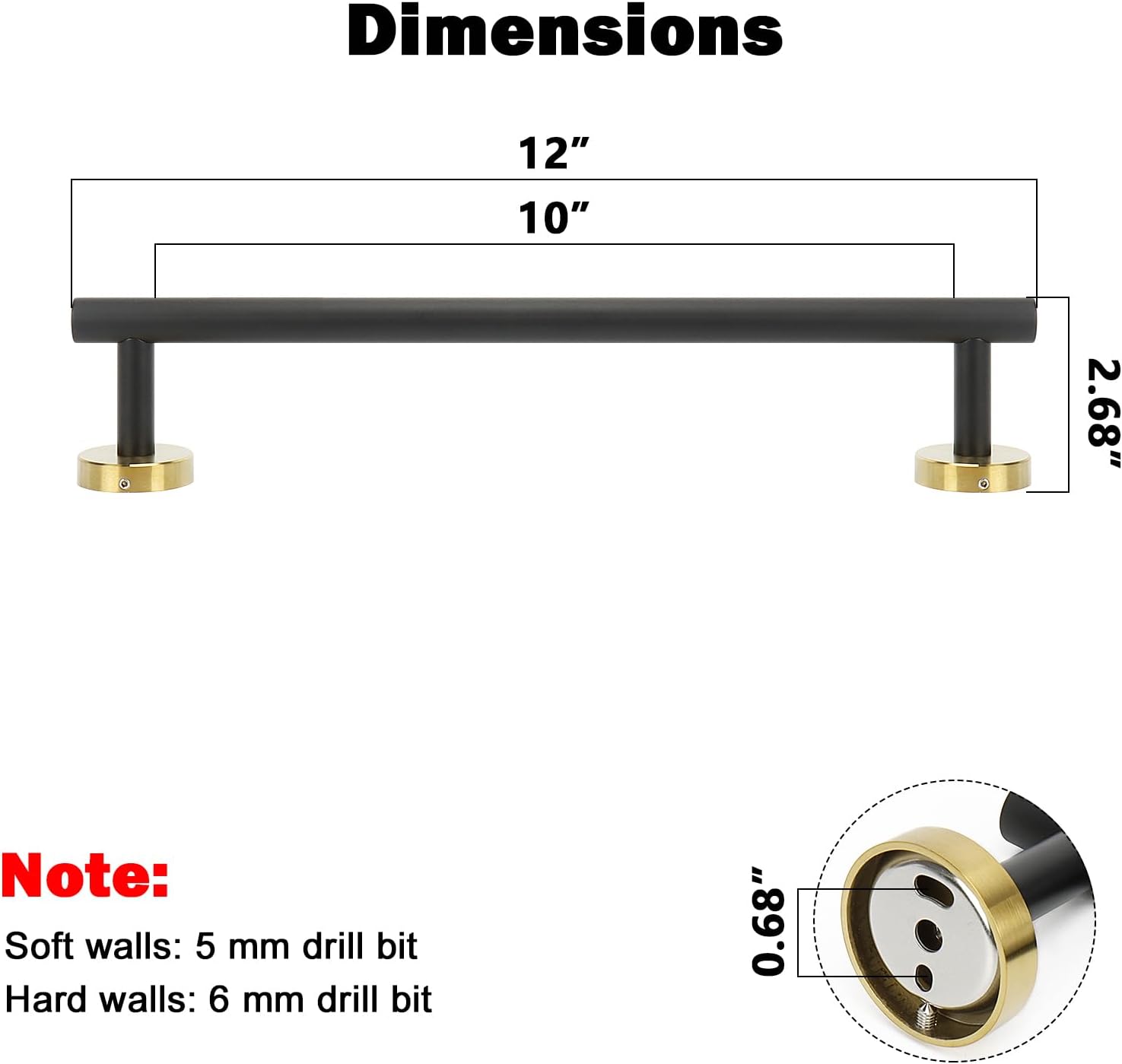 - DIMENSIONS & Use: Overall length is 12" (304mm). The length of hanging space is10" (250mm). 22-Lbs (10kgs) max weight capacity. You can mount this towel bar to either side of your cabinet or closet door for storing at-use hand and dish towels. It can also be used with S hooks, hanging bath balls, hair dryers, tea cups, spoons, clips, etc.
