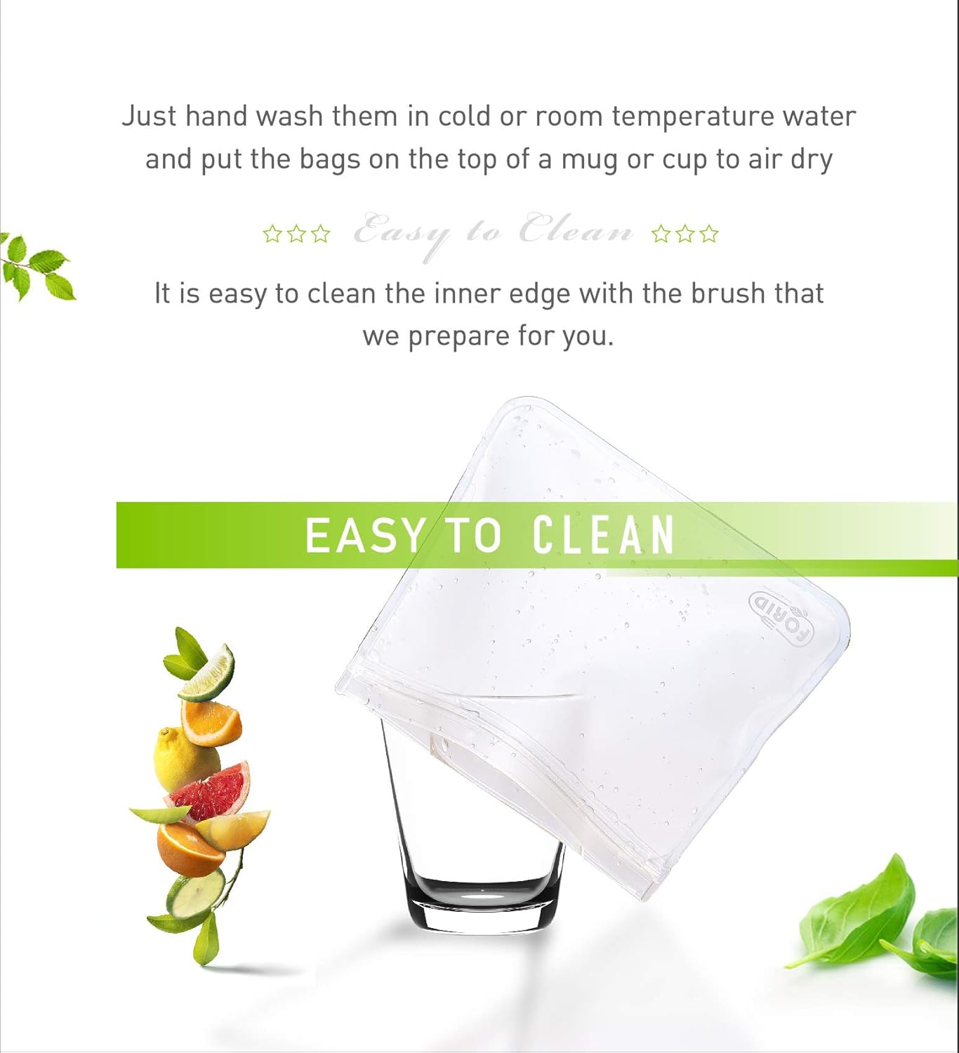 - Easy To Clean - We recommend hand wash gallon freezer bags with soap in cold or room temperature water. It is easy to clean the inner edge and get rid of any smell with baking soda and the brush that we prepare for you. Then put them over a rack or cup to air dry. Don’t use hot water, microwave or dishwasher, which will damage the washable Freezer Bags.