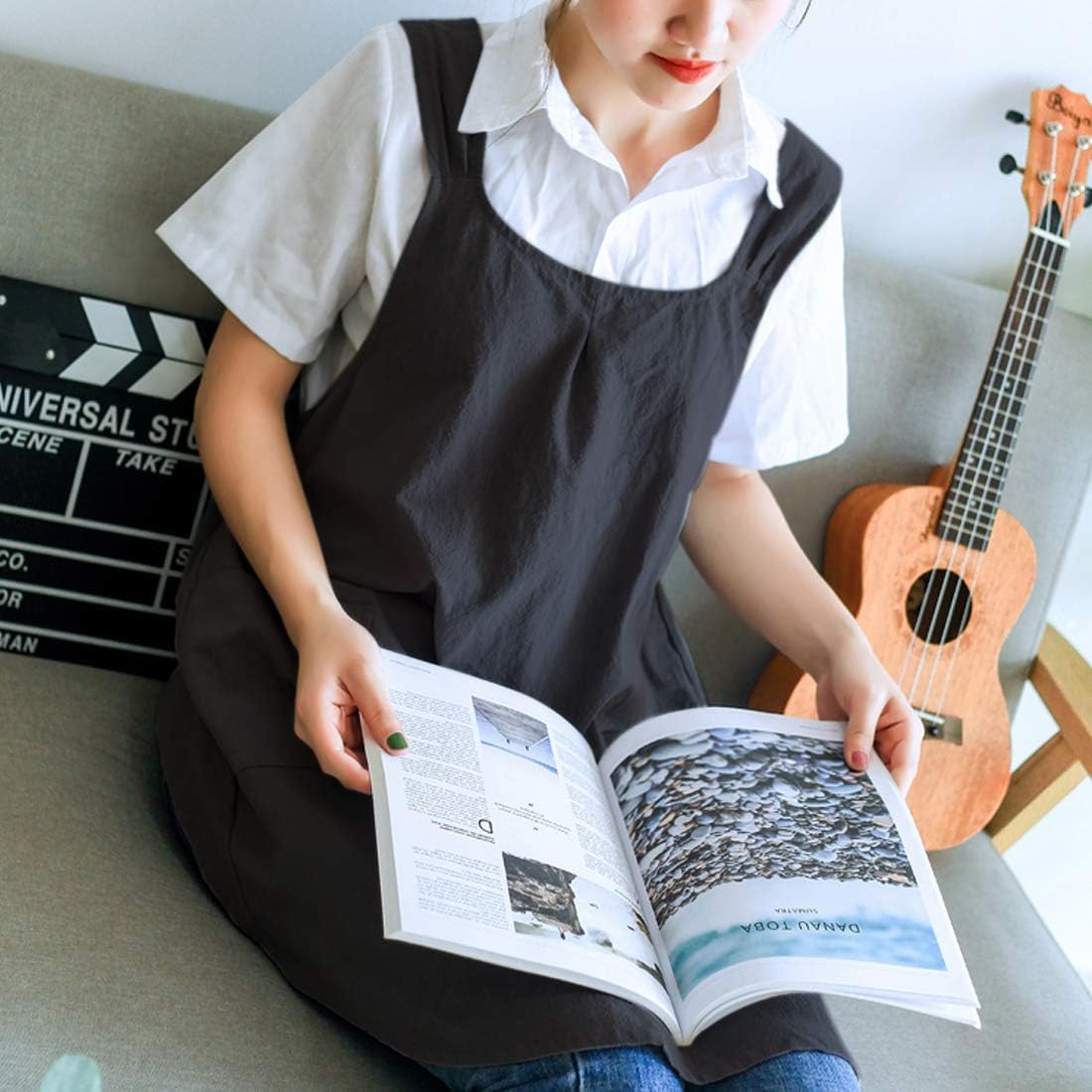 NEWGEM Japanese Linen Cross Back Cooking Aprons for Women Men with Pockets Cute for Baking Kitchen